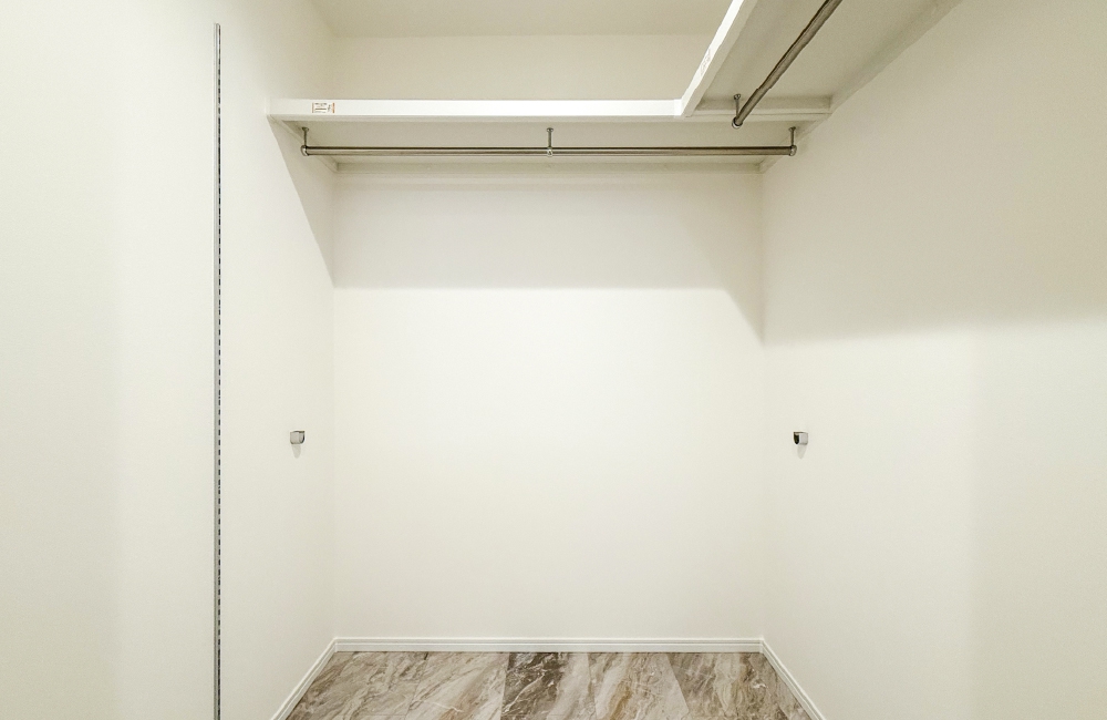 主寝室には、ウォークインクローゼットを設置。洋服はもちろん、スーツケースや季節家電などの大きなものもすっきり収納できます。隣には、メイクやワークスペースとして使える造作カウンターを設置。腰壁でほどよく仕切られているので、落ち着いて作業や身支度ができる快適な空間です。