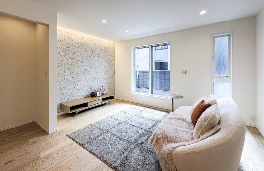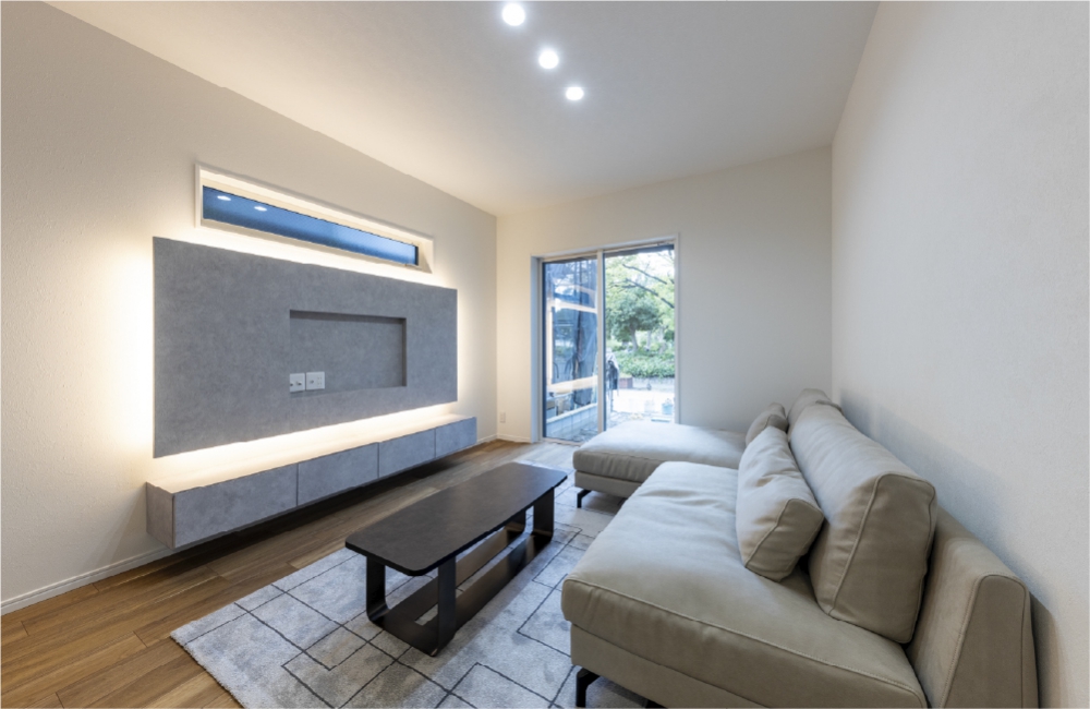 南側と西側に設けた窓から陽光がたっぷりと差し込み、リビングは明るく開放的な雰囲気に包まれます。テレビ背面のフカシ壁に仕込んだ間接照明がやさしく灯り、夜は落ち着いた空間を演出します。さらに、フロートタイプのテレビボードを採用し、見た目もスッキリとした印象に仕上げています。