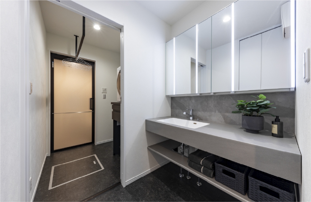 3帖を超える広さの洗面・脱衣室は、お出かけ前のメイクやお風呂上がりのスキンケアを、座ってゆったりと行える心地よい空間です。幅1,500mmのワイドな洗面台は、二人並んでもゆとりの広さ。鏡裏の収納や可動棚なども備えており、タオルや日用品、スキンケア用品までキレイに収納できます。