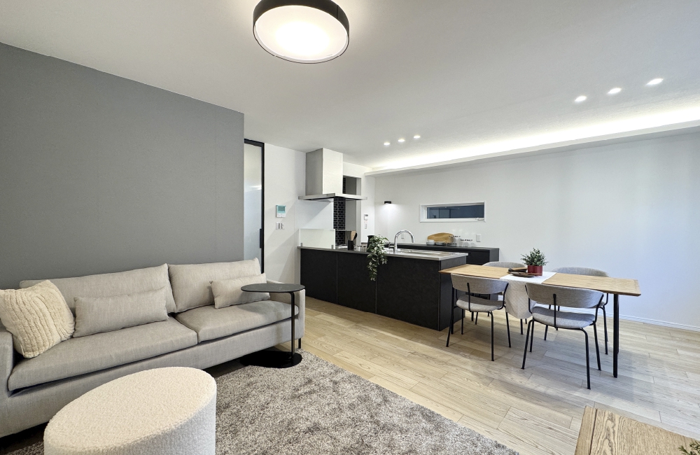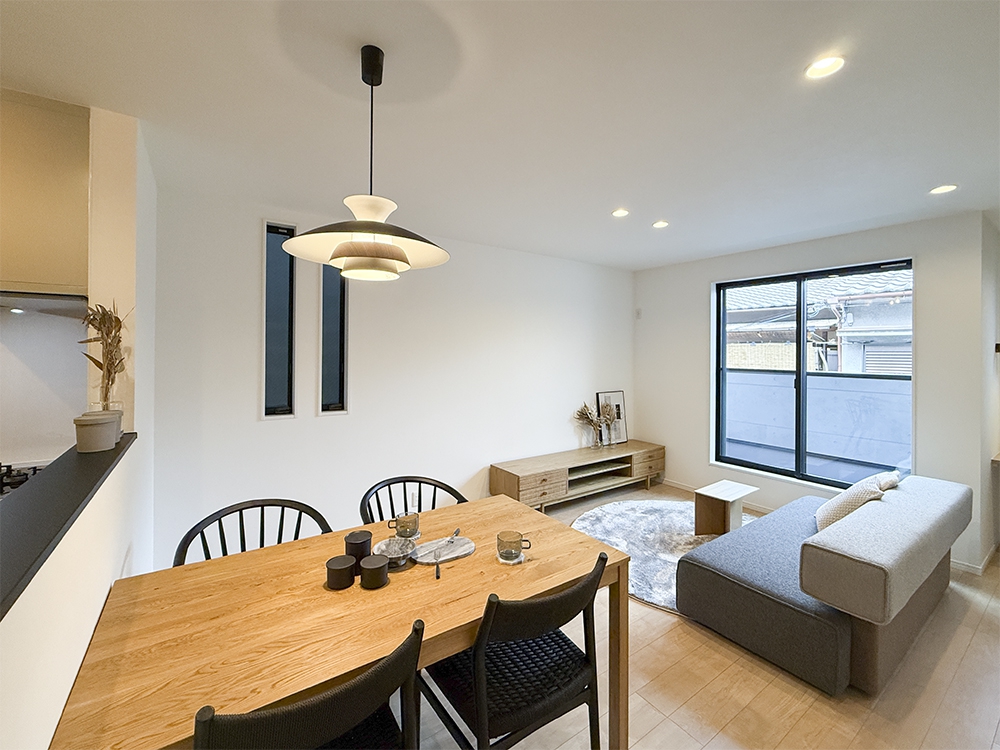 家事をしながらでも、ふと顔を上げれば家族の笑顔や気配を感じられる、ぬくもりに満ちた心地よいお家です。キッチンとダイニングは横並びの配置で、食事の配膳や後片付けもスムーズ。お子さまも自然とお手伝いしやすく、家族みんなで協力しながら過ごせる工夫がちりばめられています。対面式のキッチンからは、リビングやダイニングを見渡すことができ、お料理中も会話が弾み、家族のつながりを感じられるのも嬉しいポイント。LDK全体は天井高約2.5mのゆったりとした空間で、二面に設けた開口部から差し込む光がリビングを明るく包みます。さらにテレビ背面のフカシ壁には間接照明を仕込み、夜にはやさしい光が広がる落ち着いた空間に。毎日の暮らしの中に、家族の笑顔と心地よさがあふれる住まいです。