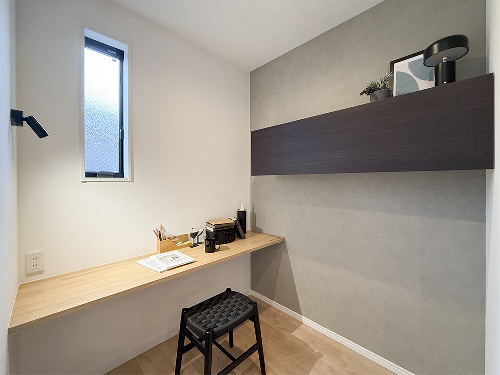3階の廊下に設けた独立型のワークスペースは、ほどよいおこもり感があり、集中したい作業にもちょうどいい空間です。スタディコーナーはもちろん、テレワークや読書、趣味の作業など幅広く活用できます。収納も充実しており、本や書類、文房具などを手の届く場所にスッキリ片づけられます。