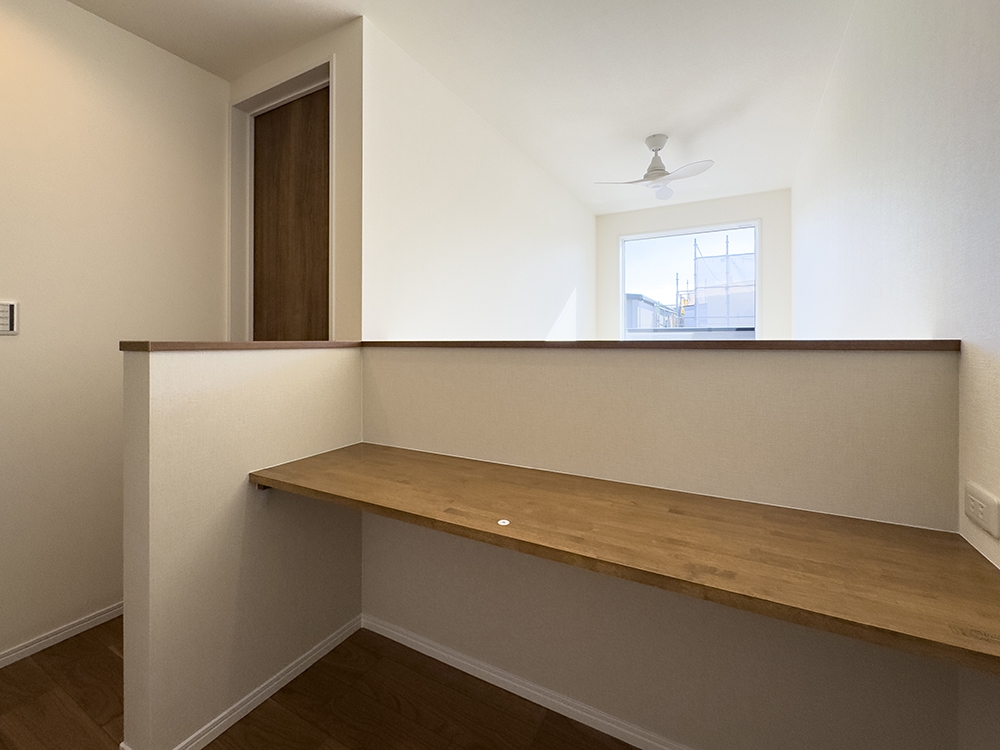 3階のホールにある、明るくて開放感のあるワークスペースです。ゆったり使えるワイドなカウンターだから、お子さまたちが仲良く勉強できます。吹抜けを通してリビングともつながっているので、家族の声や気配を感じながらも自分のことに集中できる、ほどよい距離感が心地よい空間です。