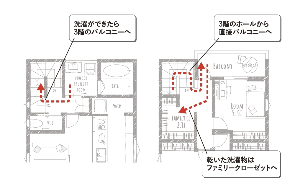 キッチンのすぐ後ろに、洗面・脱衣室、バスルームを配置しました。水廻りを1ヶ所にまとめることで、家事動線がスムーズになり、日常の家事効率がアップします。また、バルコニーも同じフロアにあるので、洗濯物を干す際の移動距離が短く、洗濯かごを持って階段を上り下りする必要がありません。