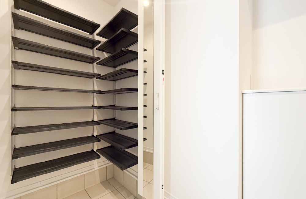 毎日の暮らしを快適にする工夫が、家中にちりばめられた住まいです。玄関には、生活感をさっと隠せる扉付きのシューズクローゼットを設置。さらに、コートなどを掛けておけるハンガーパイプも備えており、お出かけ前の身支度もスムーズに行えます。1階には、洋服からスーツケースなど大きなものまで収納できる、大容量のウォークインクローゼットを設けました。キッチンにはカップボードに加え、冷蔵庫までスッキリ収まるパントリーも完備。さらに3階には、廊下のスペースを有効活用したウォークスルークローゼットをご用意。システム収納を採用しているため使い勝手がよく、日常の整頓もぐっとラクになります。日々の暮らしに寄り添いながら、快適さと使いやすさを両立した住まいです。