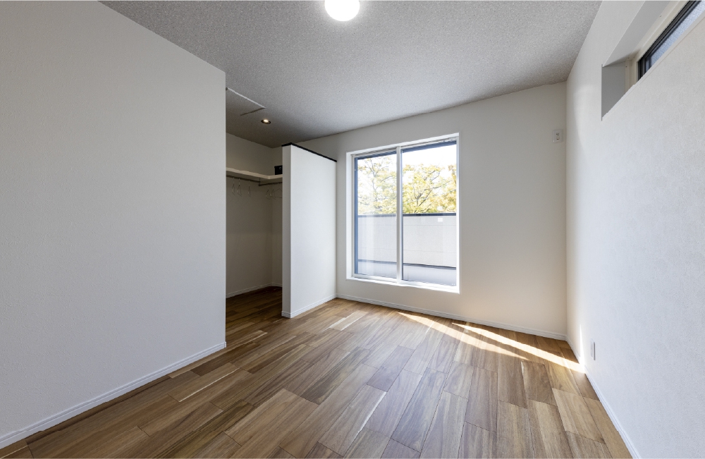 主寝室には、洋服だけでなく、スーツケースや季節家電、布団など大きな物も収納できるウォークインクローゼットを設けました。たくさんの荷物をまとめて片づけられるので、お部屋はいつでもスッキリ。さらにバルコニーに面しているので、風通しもよく、気持ちいい空間でゆったり過ごせます。