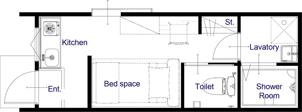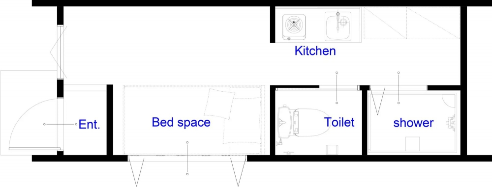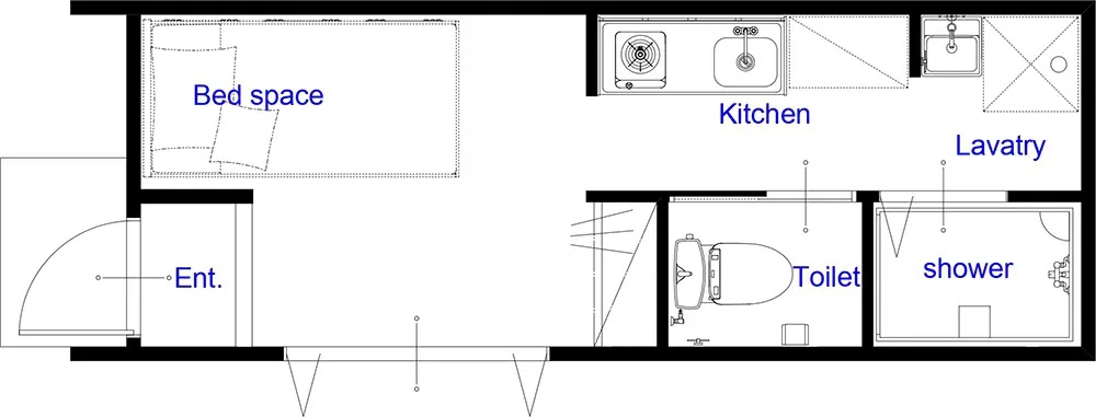 キッチン、シャワールーム、トイレ、ベットスペース