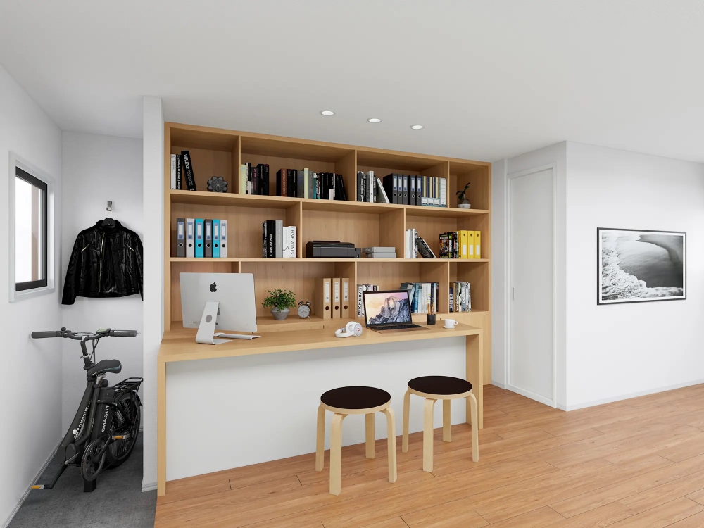 ワークスペース、キッチン、トイレ、シェルフスペース、自転車置き場、フリースペース