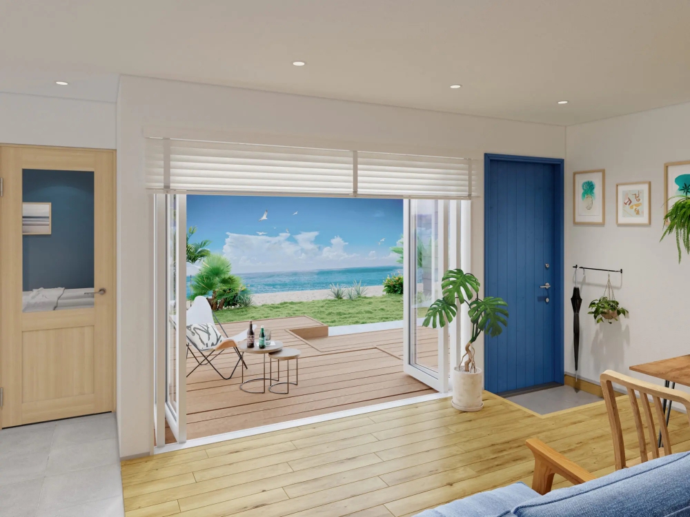 ●PRODUCT STORY(商品ストーリー)---海やグリーンを眺めながら 心癒される非日常の時間 ウッドデッキに出れば、視線の先に広がる自然。コンパクトな間取りの中でも、窮屈さを感じさせない開放感のある空間。