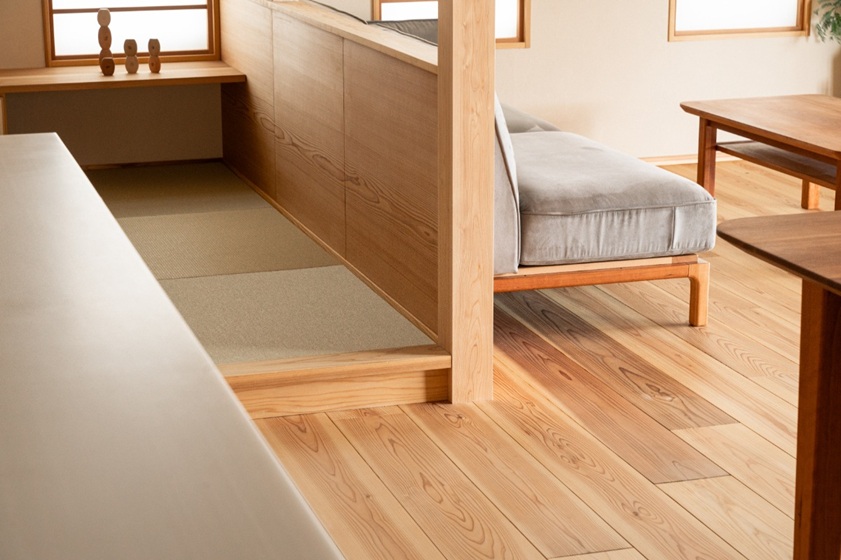 その中でもこだわっているのが、国産の檜(ひのき)。日本の気候で育った木は、湿度や気温の変化をよく知っており、高い調湿性・耐久性を持ち、くるいが少ないのが特長です。人は元々、木の素材を好み生活してきました。私たちの体は木の心地よさを知っているのです。心地よさの成分、フィトンチッドには人に安らぎを与える反面、抗菌効果があるのでカビやダニ、シロアリに強い特徴を持っています。