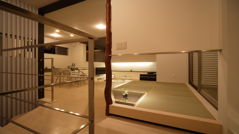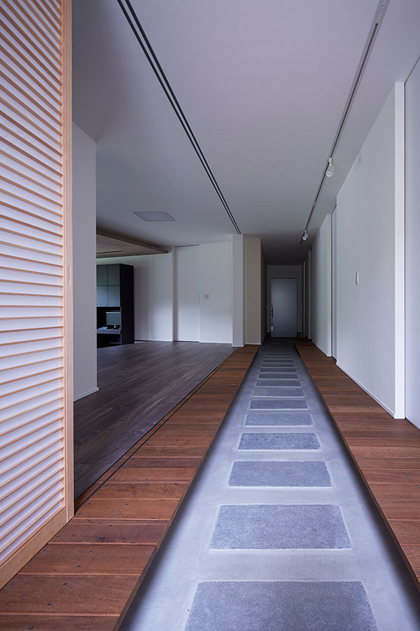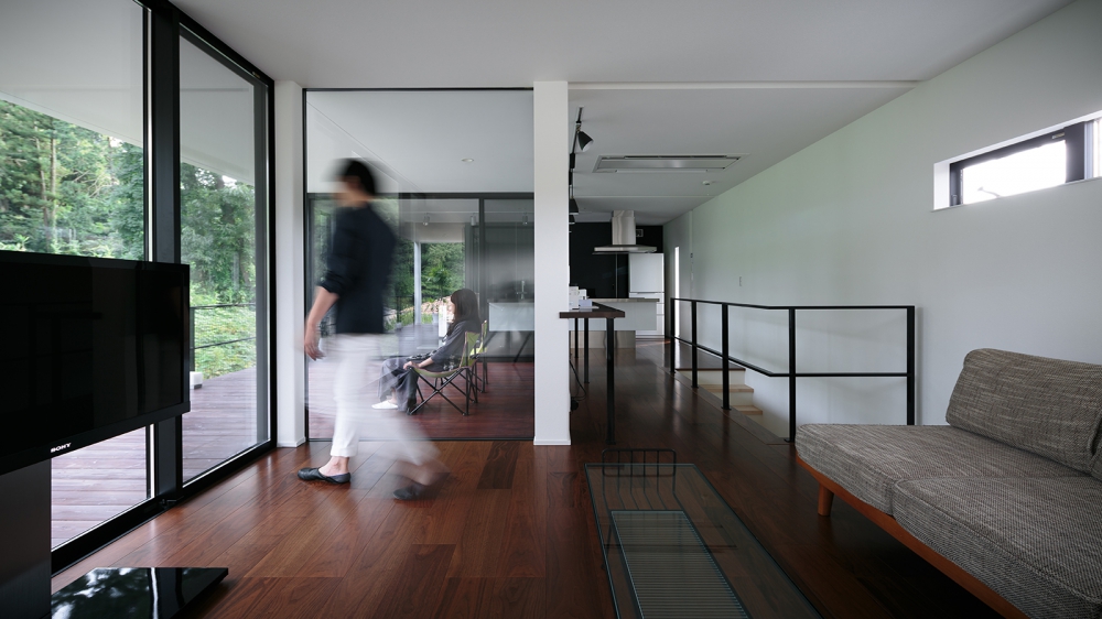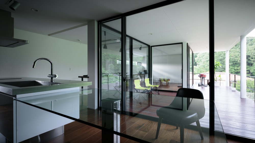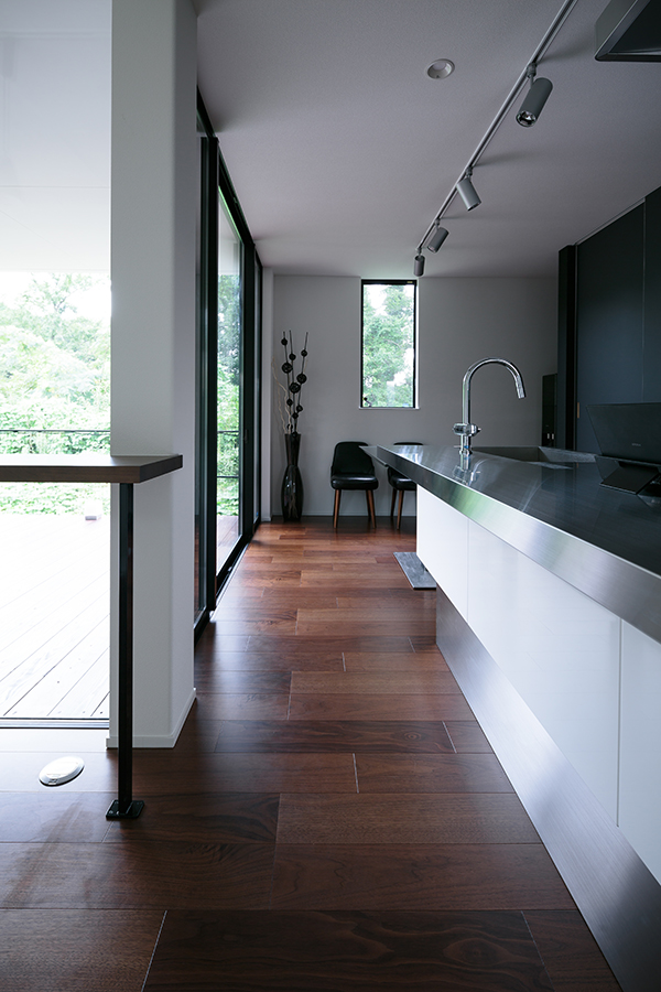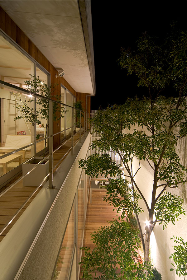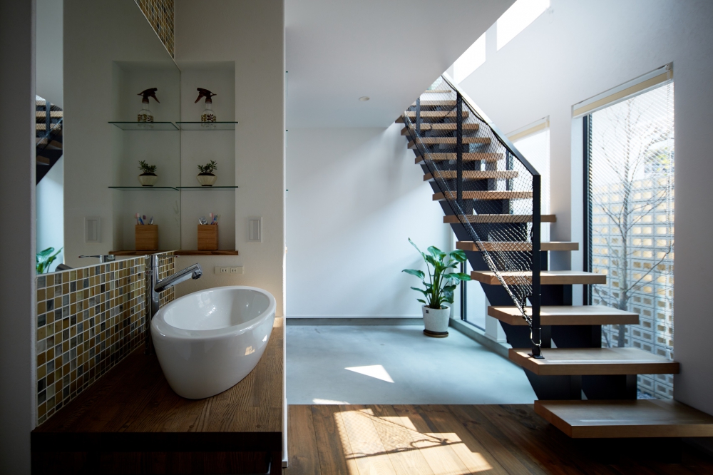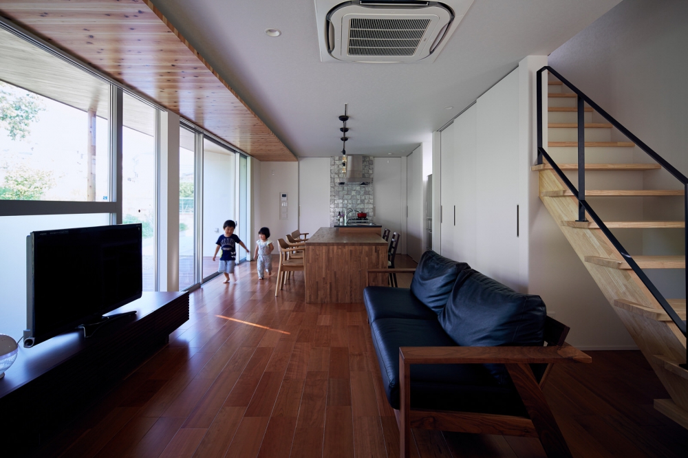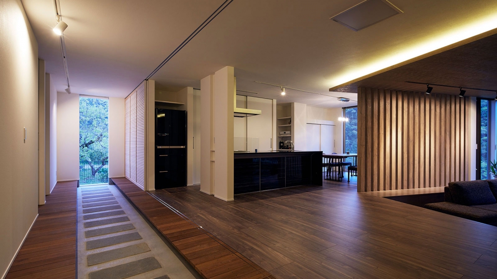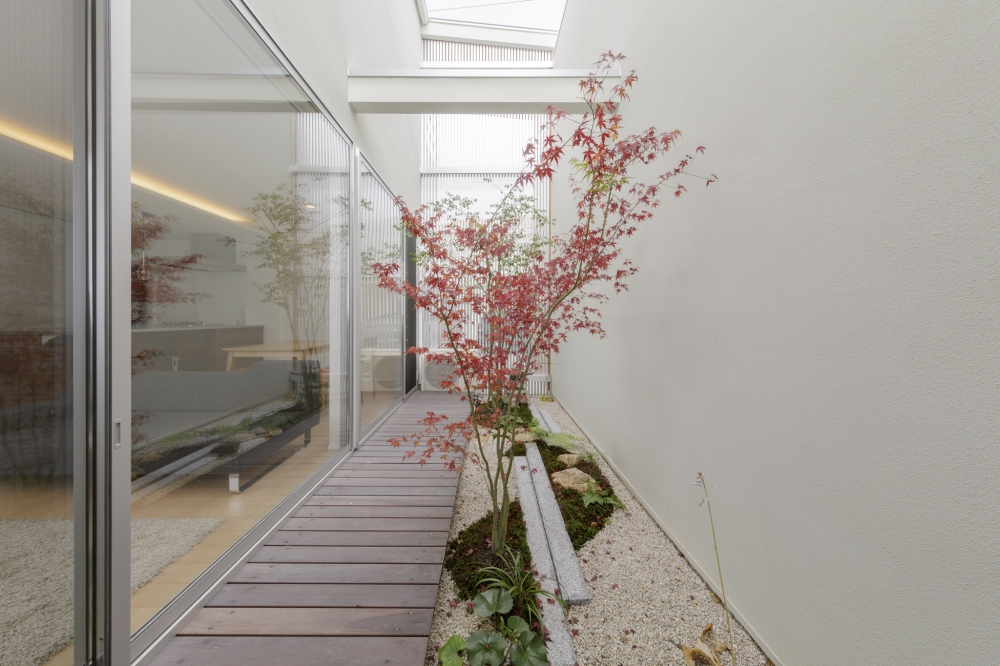 3つの庭を設け、フルフラットに居住空間と庭がつながる設計とし、屋内・屋外空間すべてを連続させた。外へ出やすく全天候型で活動量も自然と増える。植栽をふんだんに配し心理的にも落ち着きがある。アクティブなウッドデッキの庭・アウトドアダイニングができる庭・静寂な石の庭、それらが彩る豊かさがこの家の最大の魅力である。