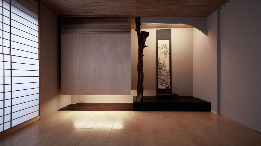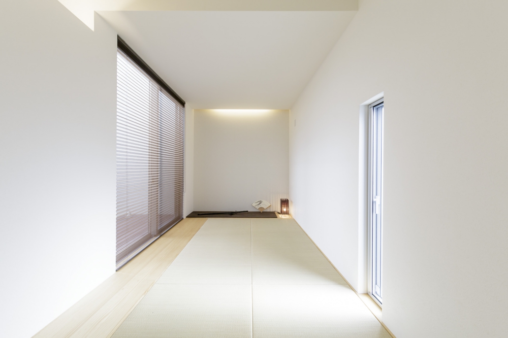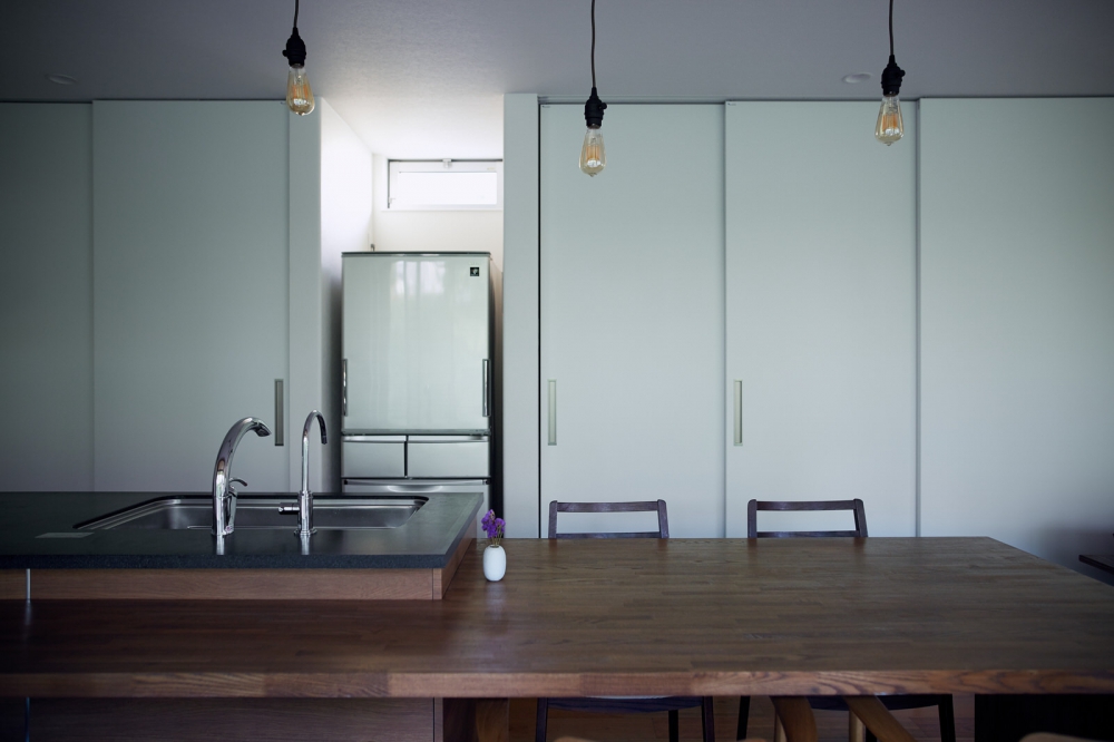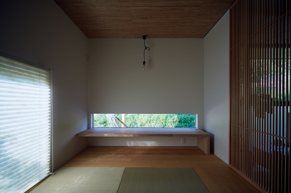 裏庭の緩やかな丘の借景を室内に取り込むため、深い土庇と縁側を軸に構成。太陽高度を計算した庇により夏は日射を遮り、冬は光を室内奥まで導く。大開口で明るく開放的なLDKとし、電気に頼らない快適性を実現。オープンキッチンや豊富な収納で使い勝手にも配慮した。縁側越しに子どもの様子を見守れ、遊びや団らんも楽しめる。和室は地窓と素材感が借景を引き立て、四季を味わう住まいとした。