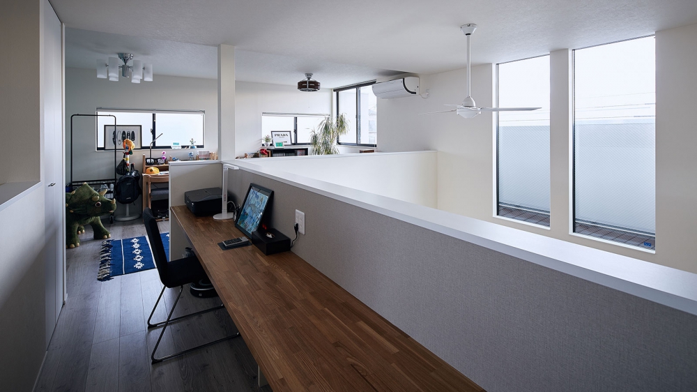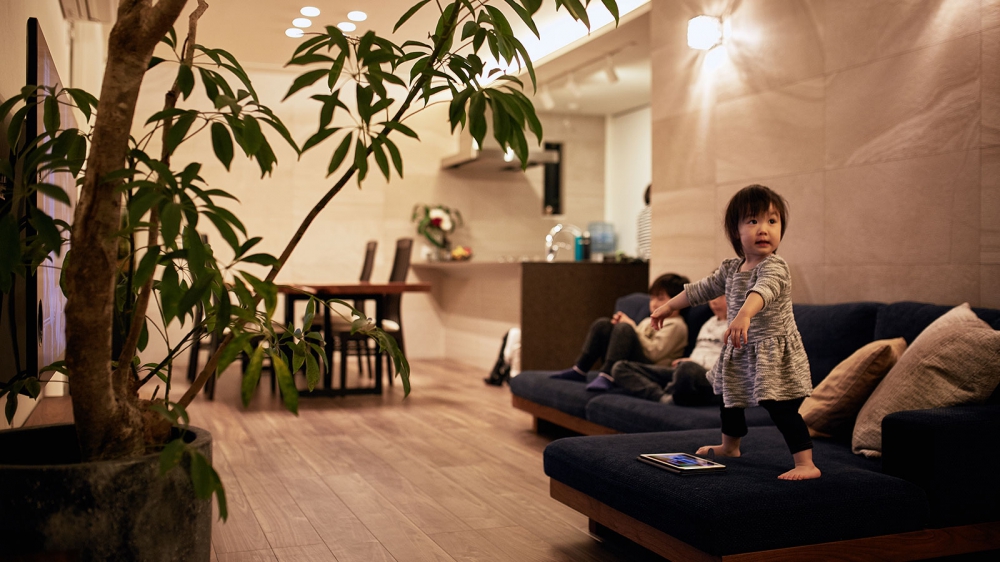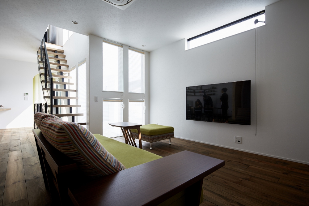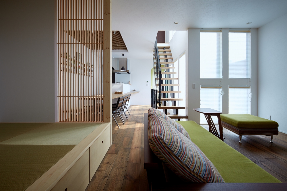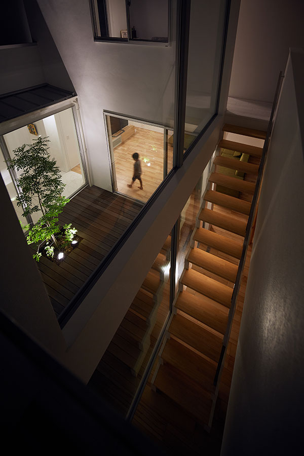 6人家族のための3階建住宅。住宅密集地のため、特にプライバシーの確保や騒音対策に配慮しました。リビングの吹抜けに面して、子供部屋やスタディスペースを配置しています。寝室は現代的な和室とし、四季の移ろいや静けさを感じられる坪庭も。上階にあるバルコニーは、下階の庇としても、外観のアクセントとしても機能しています。吹抜けやデッキテラスがある開放的なリビングは、家族がゆっくりとくつろげる家になりました。