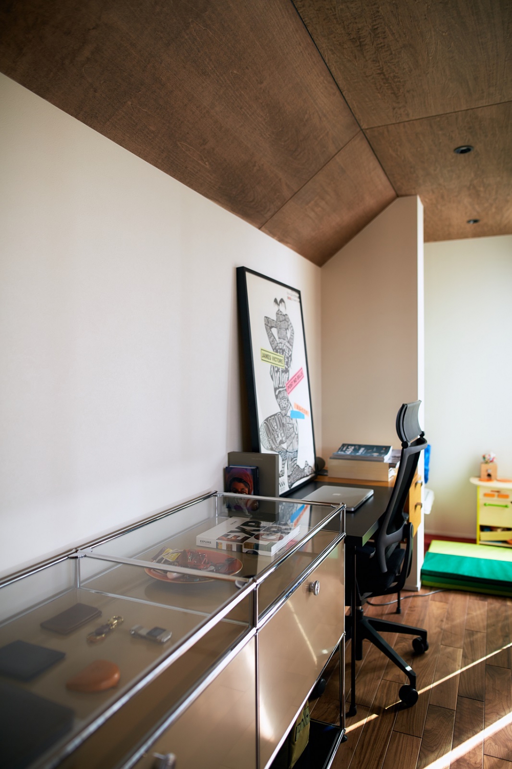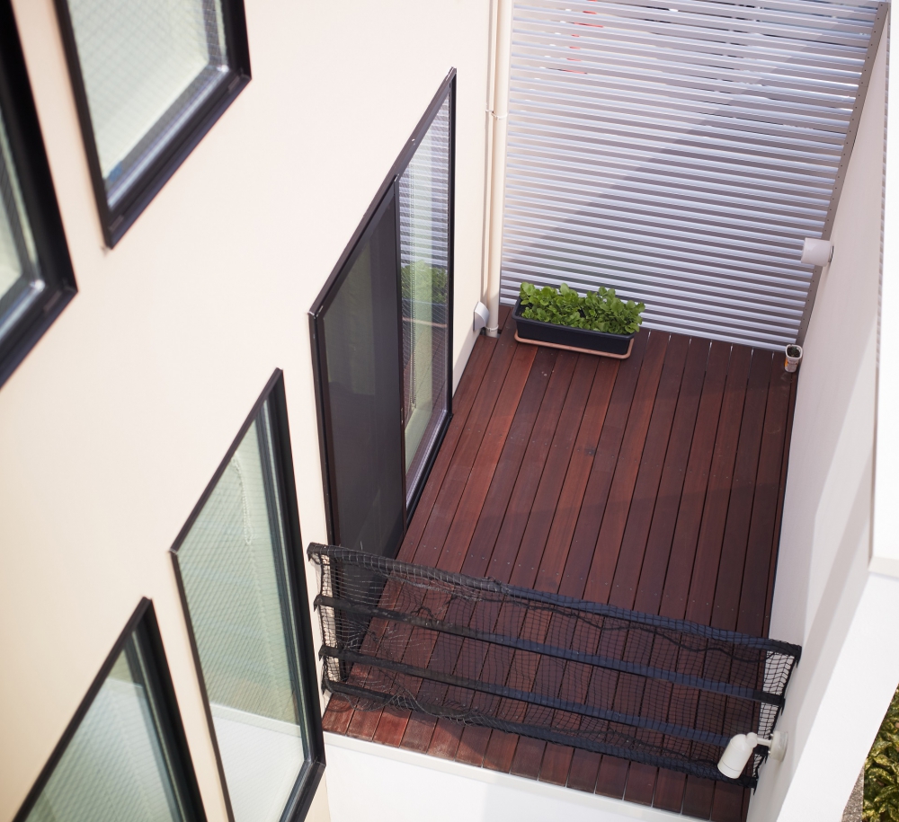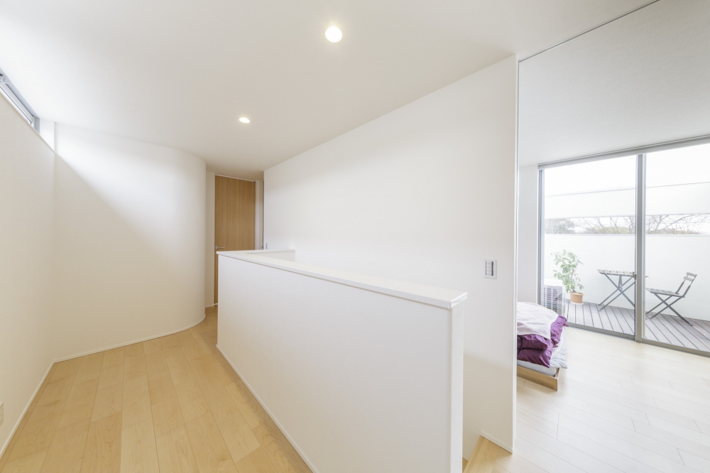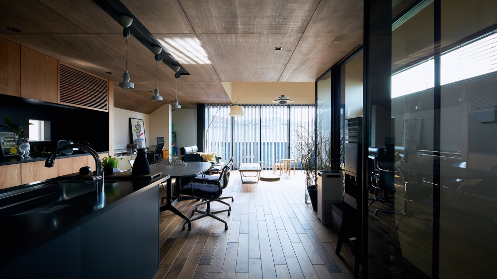 6人家族のための3階建住宅。住宅密集地のため、特にプライバシーの確保や騒音対策に配慮しました。リビングの吹抜けに面して、子供部屋やスタディスペースを配置しています。寝室は現代的な和室とし、四季の移ろいや静けさを感じられる坪庭も。上階にあるバルコニーは、下階の庇としても、外観のアクセントとしても機能しています。吹抜けやデッキテラスがある開放的なリビングは、家族がゆっくりとくつろげる家になりました。