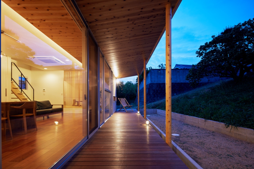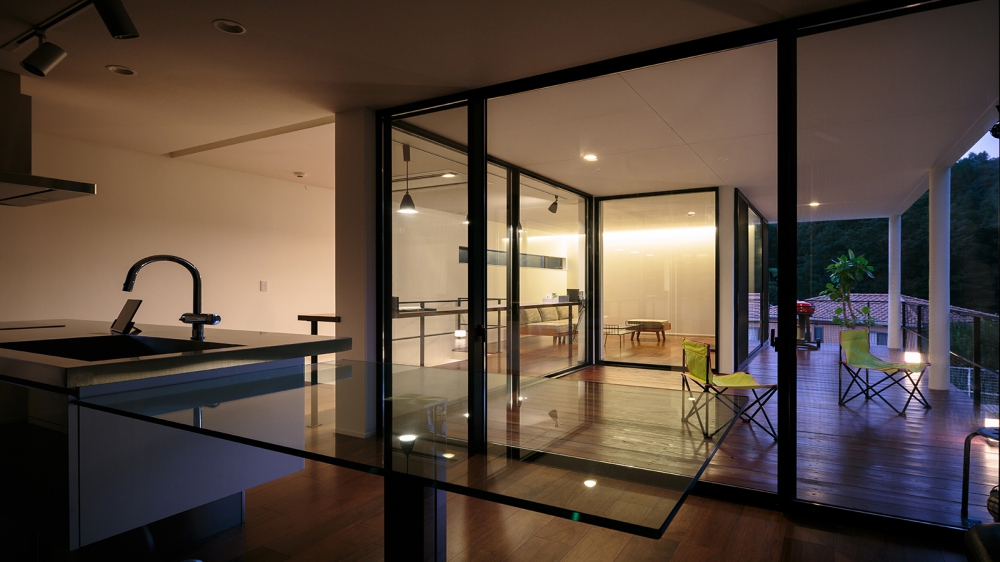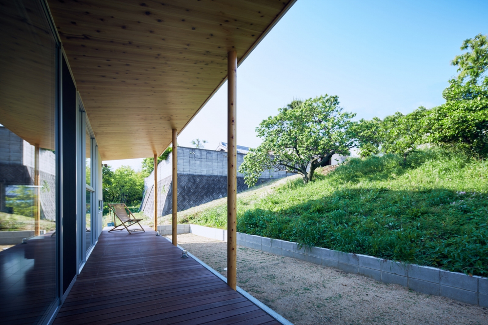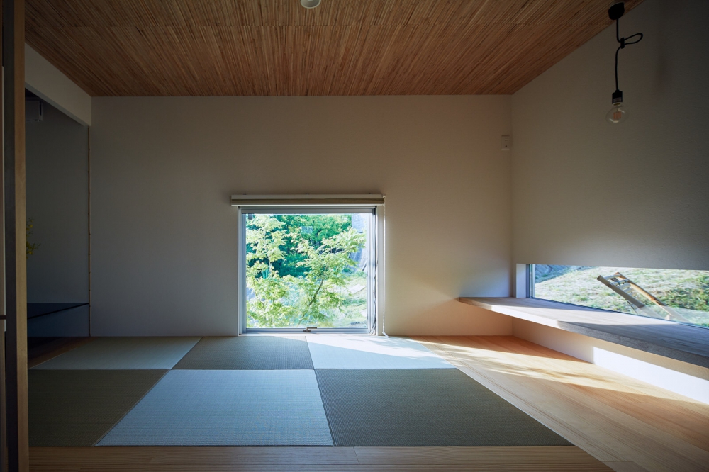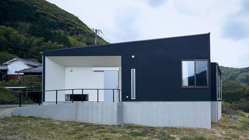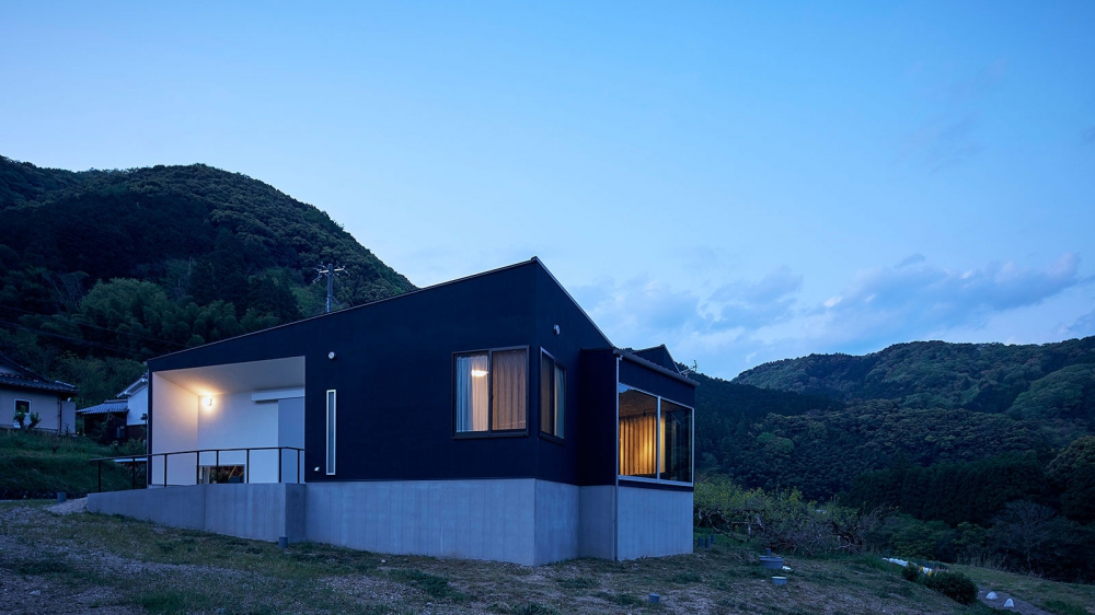 和歌山県の山間に建つ平屋住宅。蜜柑畑跡の起伏ある敷地と豊かな自然を活かし、風景を非日常へと変える空間演出を計画した。稜線に呼応する濃紺の外観は周囲に調和し、LDKには自然を切り取る大開口を配置。光や風の特性を設計に取り込み、夏は涼風を活かし冷房に頼らず、冬は高断熱と床暖房で快適な住環境を実現した。