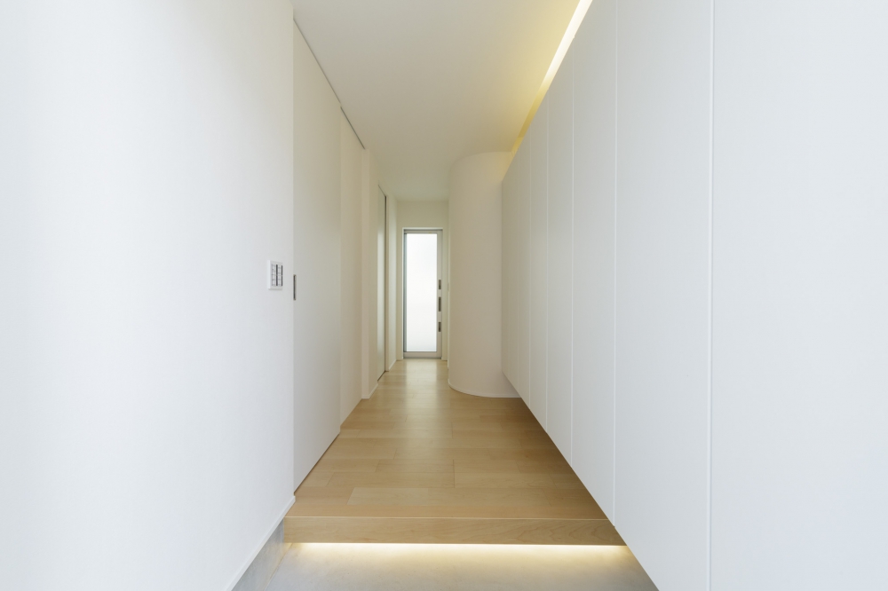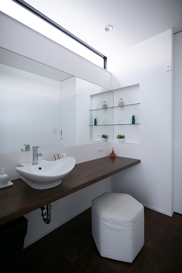 施主様にとって人生で2棟目の新築住宅ということで、新しい家に求めることがかなり明確だった印象です。インテリアで構築したいイメージの共有に余念がなく、屋内にたくさんの観葉植物を置いたり掛けたり吊ったりと緑をふんだんに配するインテリア空間を希望されていました。白いインテリア空間は、自然の緑が映えるように考えられています。