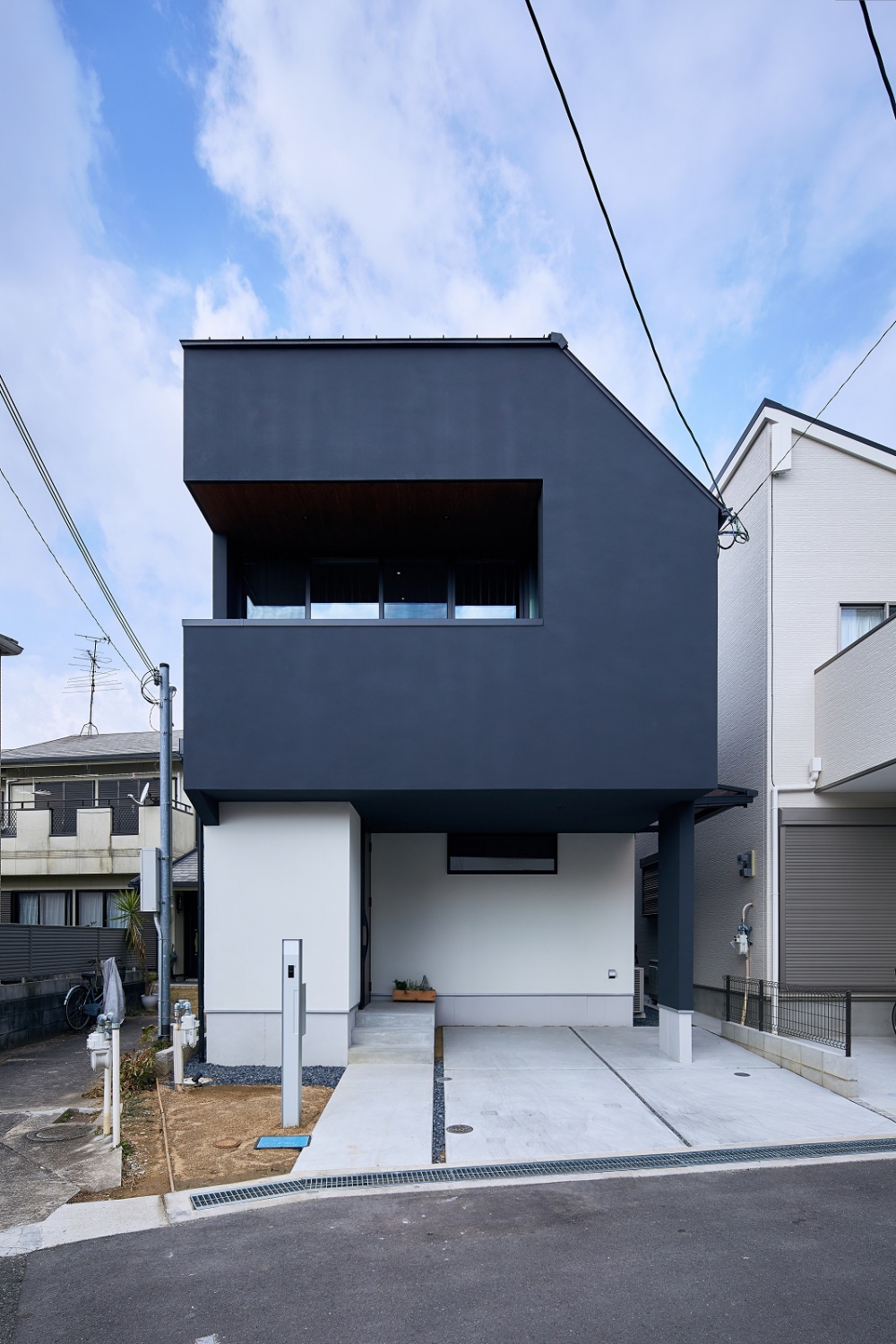 造形の美しさと動線の良さを重視した住宅で、高台という立地を活かした眺望のある設計が特徴。敷地の斜辺に沿わせた外壁が個性となり、空間に動きと面白さを与えている。モダンでシャープな外観のもと、間取りは潔く整理され、リビングやダイニングキッチンを広く確保。一方で寝室は必要十分な広さに抑え、日常を豊かに過ごすための工夫が随所に施された住まいとなっている。