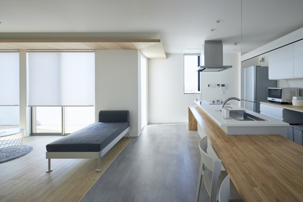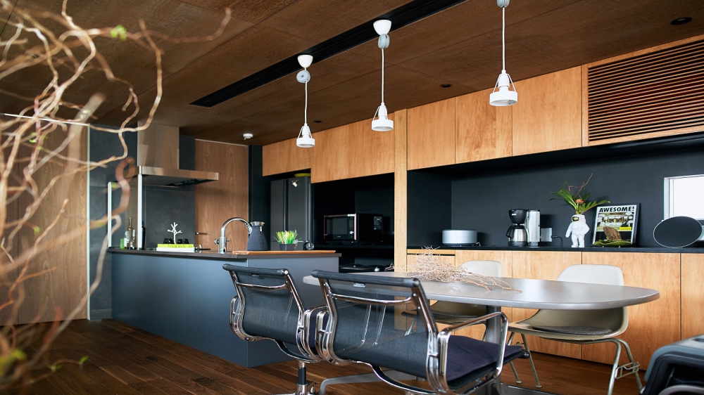 丘の上に建つ住まいで、高低差を活かしたピットリビングやスキップフロア、吹抜などの工夫により、移動するたびに変化ある空間を楽しめる。大開口からは高台ならではの絶景が広がり、光や風、季節の移ろいを感じられるのが魅力。お気に入りの家具を基にした内装とともに、家族が心地よく過ごせる住まいとなっている。