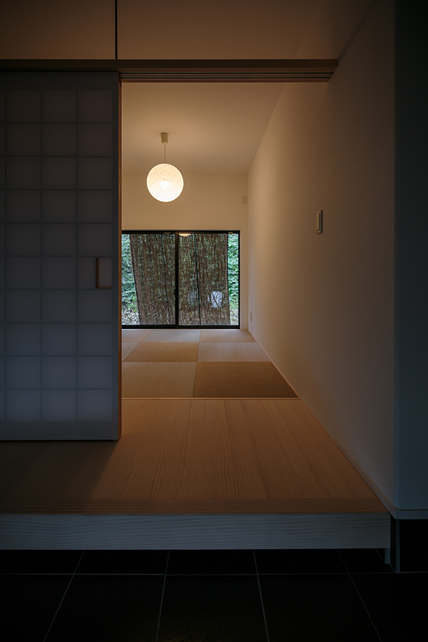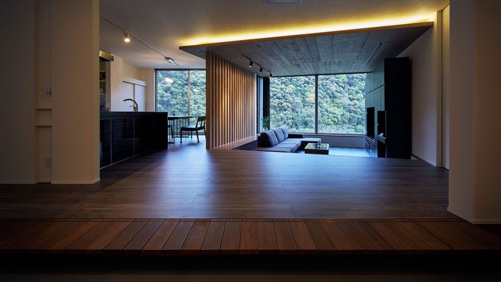 採光や通風、景観を重視しLDKを2階に配置。床とデッキをフラットにつなぎ、天井を外へ伸ばして大きな軒とし、内外の境界を曖昧にすることで広がりのある空間を実現した。階段を上がると裏山の緑を一望でき、森の中にいるような開放感が魅力。1階は町屋風に黒い石の通り土間を設け、稲妻桁の階段や小上がりの和室が調和したモダンな住まい。