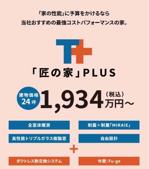 満足感は「家」だけではありません。「住む場所」「利便性」「土地の広さ」やマイホームを持った後の「充実したライフスタイル(食事、家族旅行や映画鑑賞など)」のバランスだと当社は考えます。「高性能=高価格」だが光熱費やメンテナンスで将来元がとれるという選択肢も一つですが、「性能効果=価格」の費用帯効果は理解すべきです。当社「匠の家」は職人目線を基本に造り上げたコストパフォーマンスの高いお家。まずは「安心価格」をスタートに「+α」をご予算の中でお選びください。