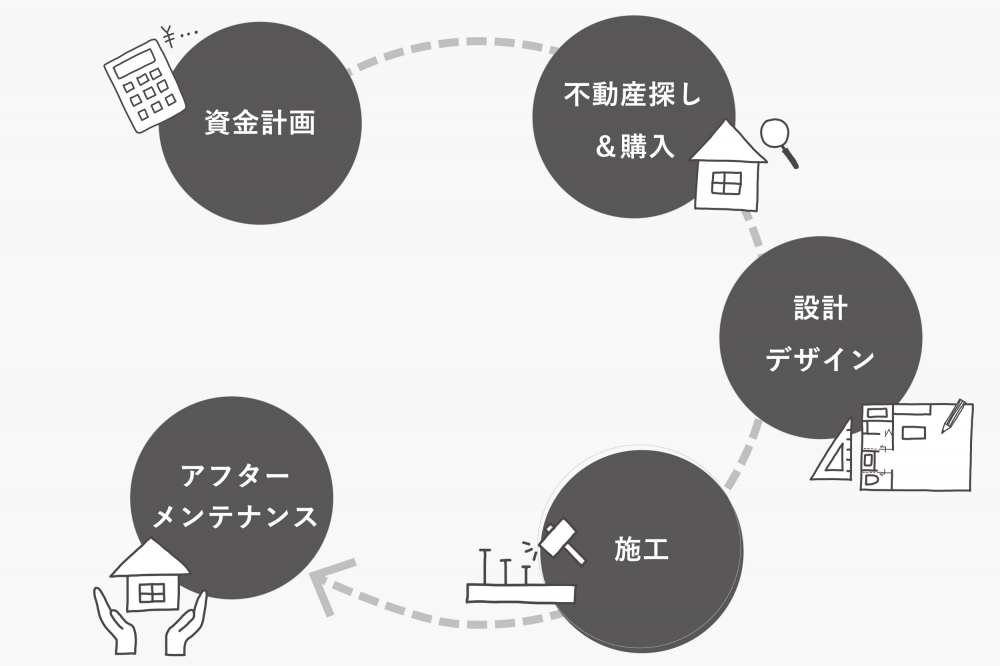 物件探し・売却、資金計画、設計・施工、リノベーション、アフターメンテナンスまで自社で一貫対応。