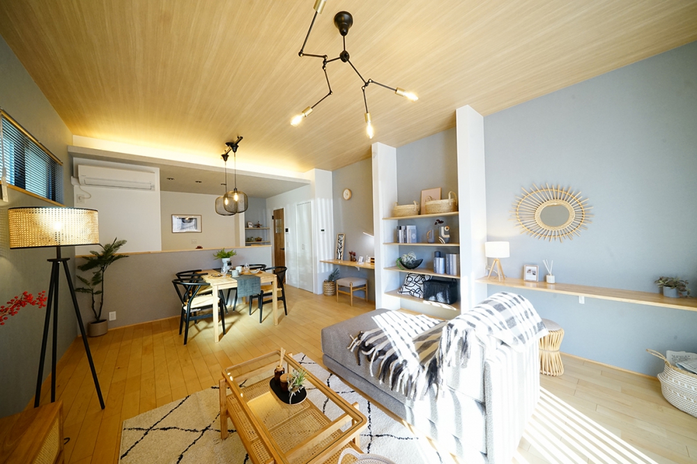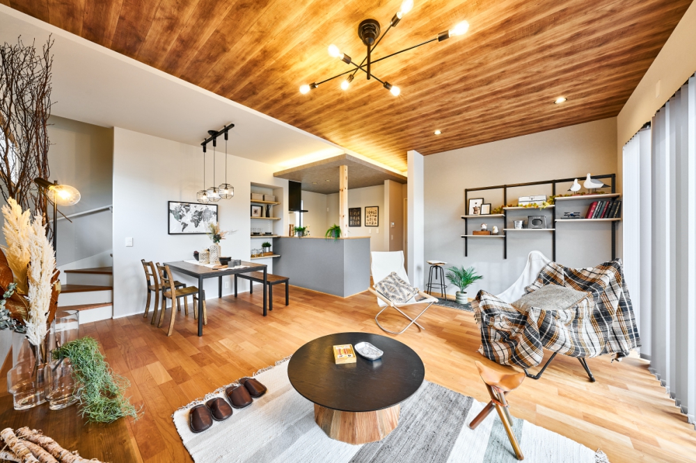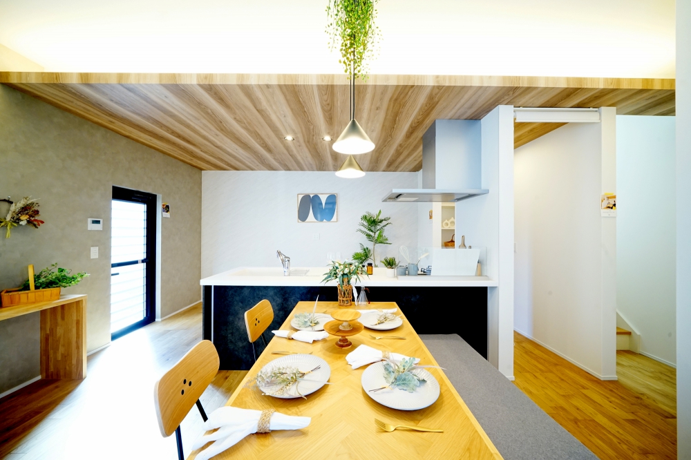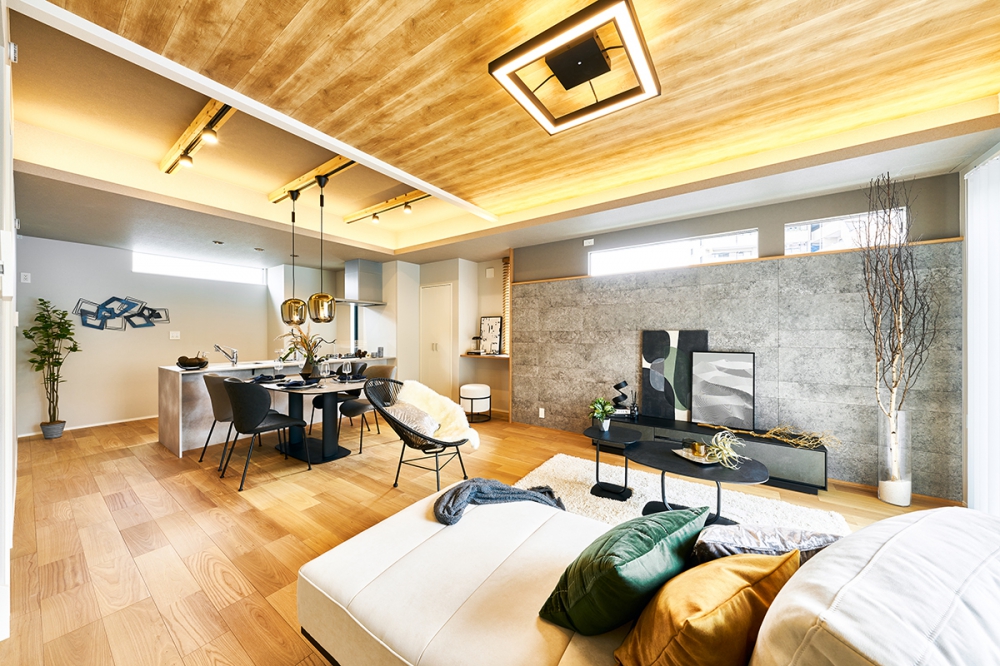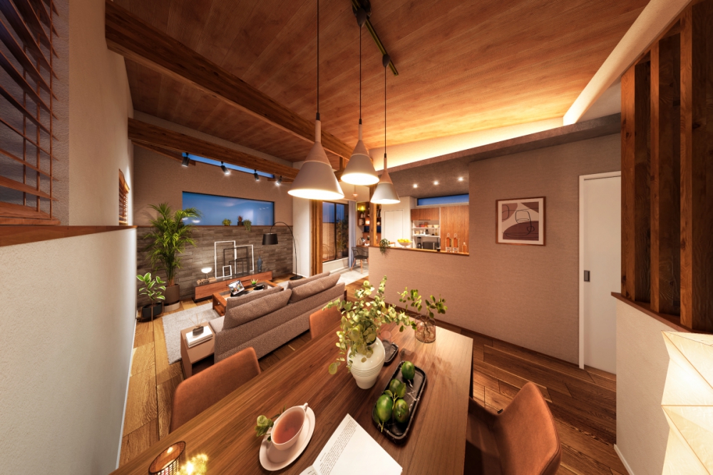 吹抜け、リビング階段、ずぼらクロゼットの家型間口、アクセントクロスを施した天井や壁面など随所におうち時間を楽しくする工夫を採用しました。※4号棟LDK完成予想図