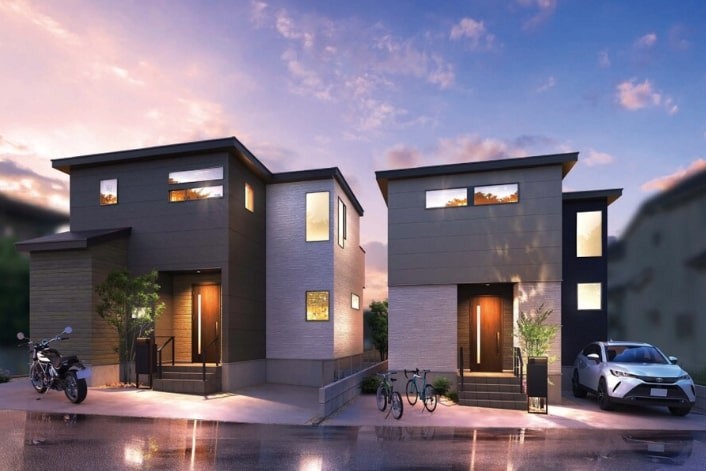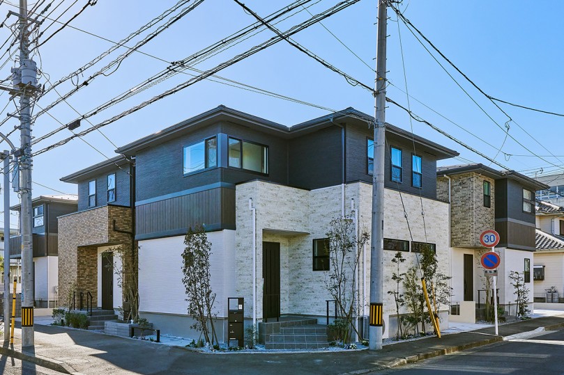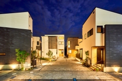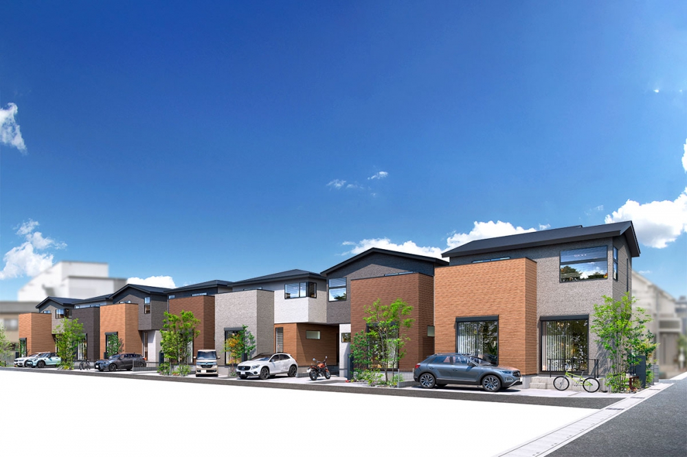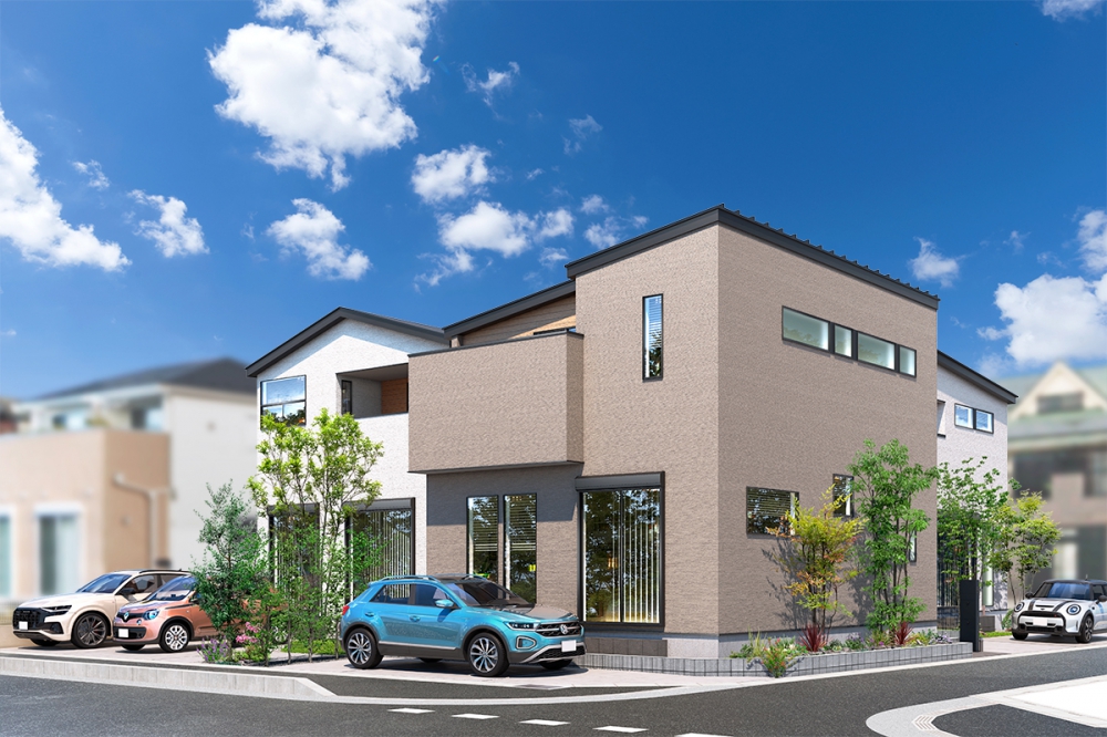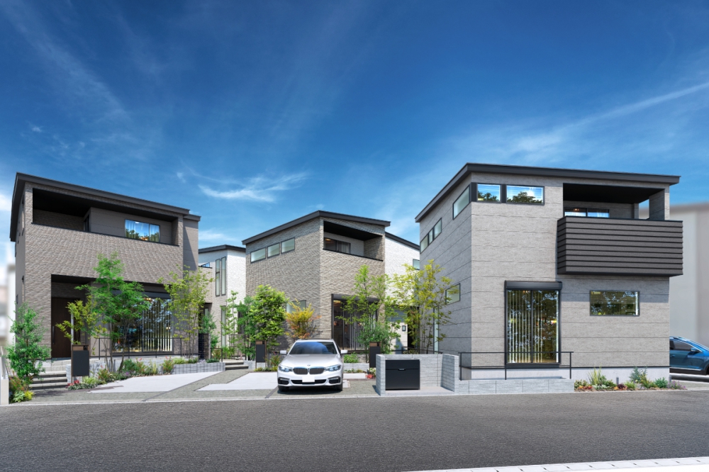 駅前の喧騒を離れた住宅街の一角に、新しい街並みをつくりました。全邸が南道路に面した立地に加え、ゆとりを生み出す街区形成を実施。品格を纏う外観デザインと快適な暮らしを演出するアイデアを込め、7組のご家族をお迎えします。※街並完成予想図
