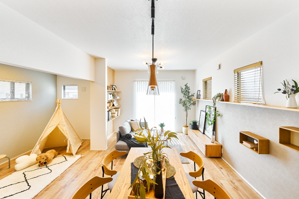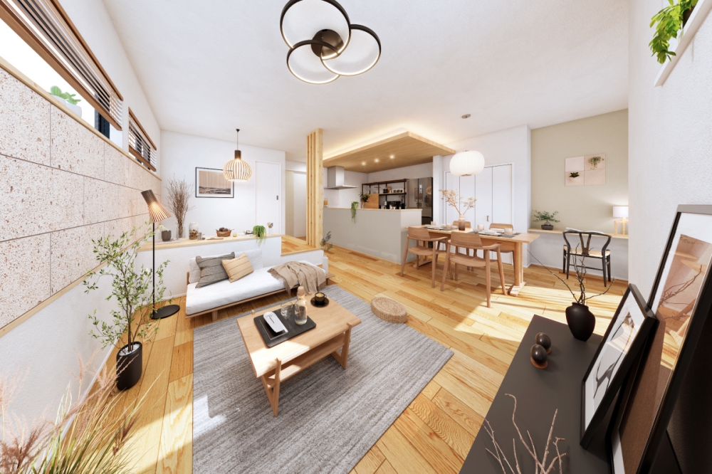 内から外まで住まいの随所で親子がふれあえて、子どもたちの自主性や感性を健やかに育てるデザイン設計を施した住まいです。※2号棟LDK完成予想図