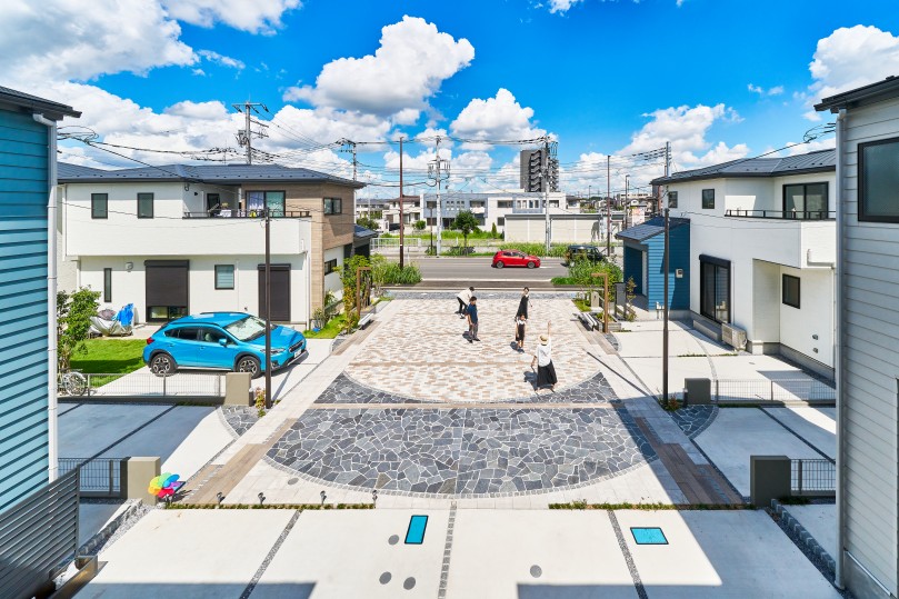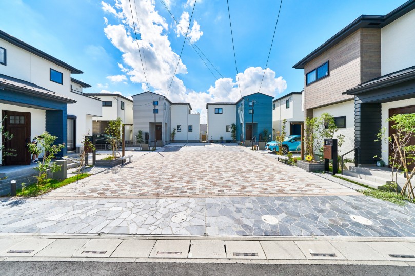 フォルムや外観の表情がまったく異なり、一邸一邸の個性を際立たせながらも、フレームやベースの色などに統一感をもたせた街並み。またアプローチ部分に広がりを創出し、隣棟間隔からもゆとりが伝わってきます。※現地街並み(2025年10月撮影)