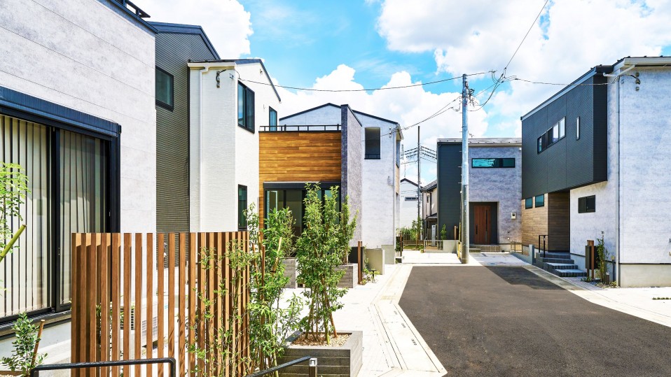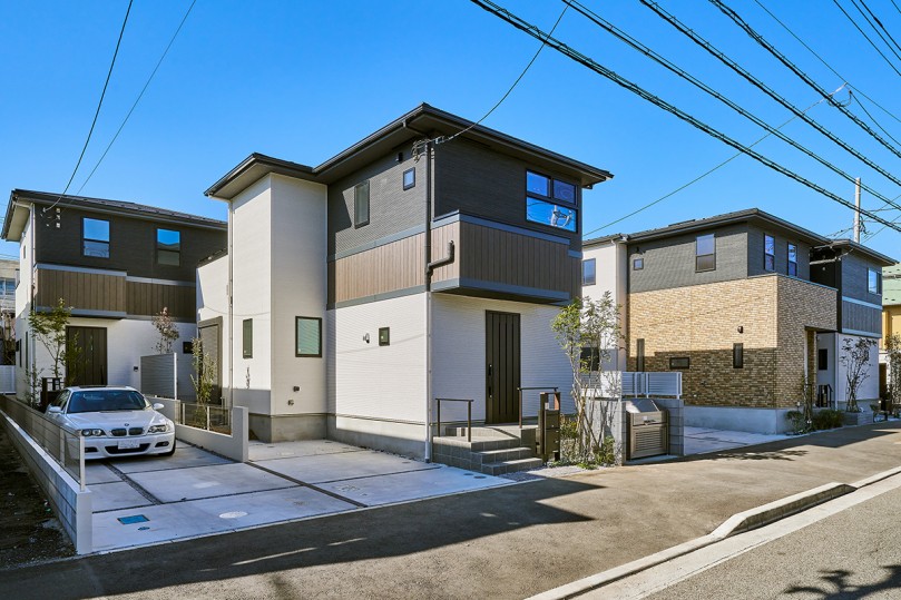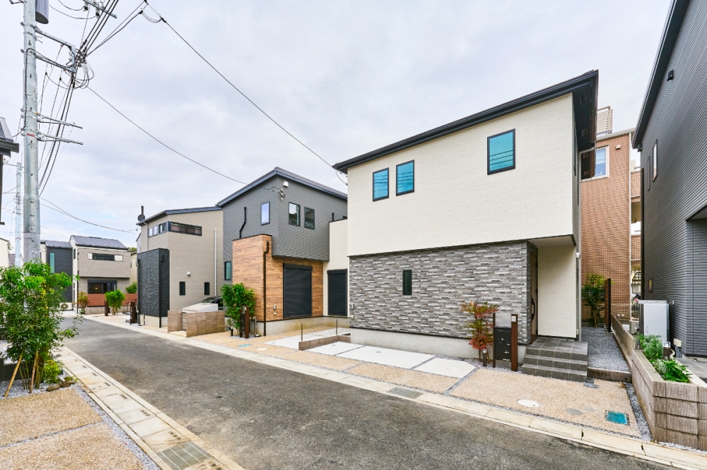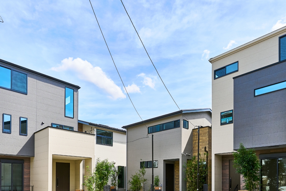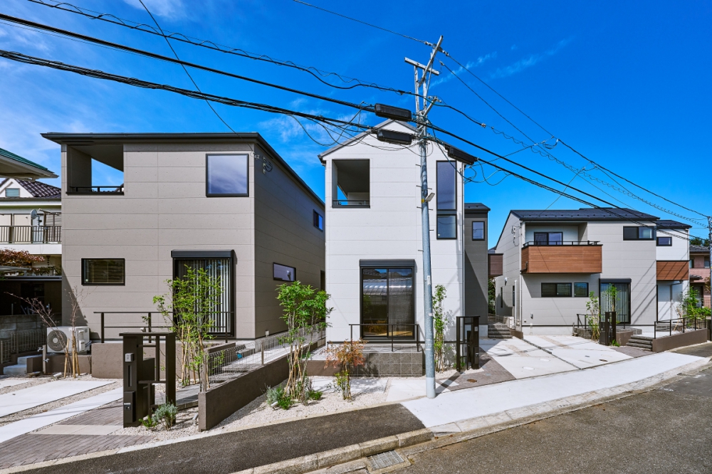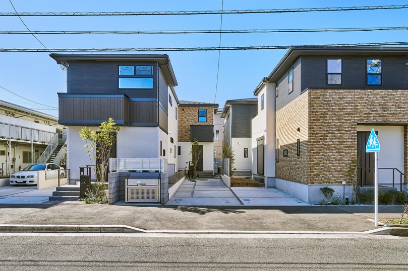 ※現地街並み(2025年11月撮影) モダンな外観フォルムを基調とした一邸一邸には、個性ある外観デザインを演出。街全体で個性が調和して、美しい景観を描く全5邸の街並みを設えました。