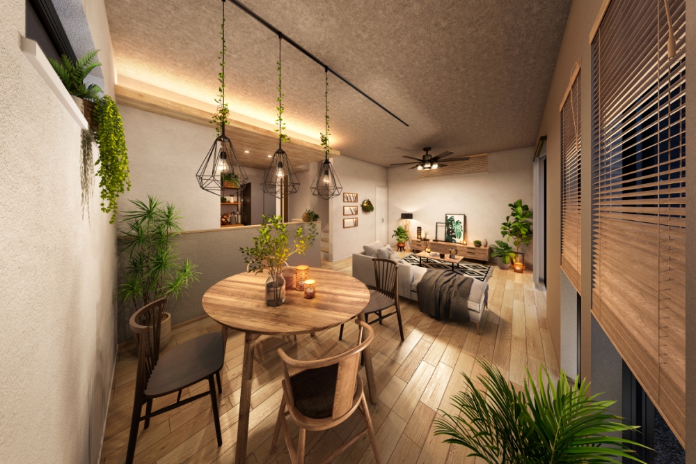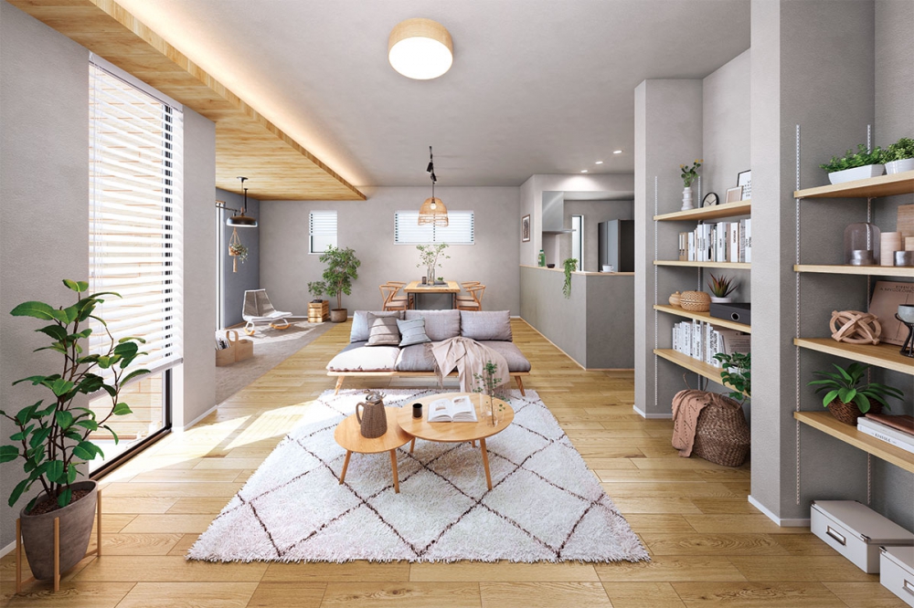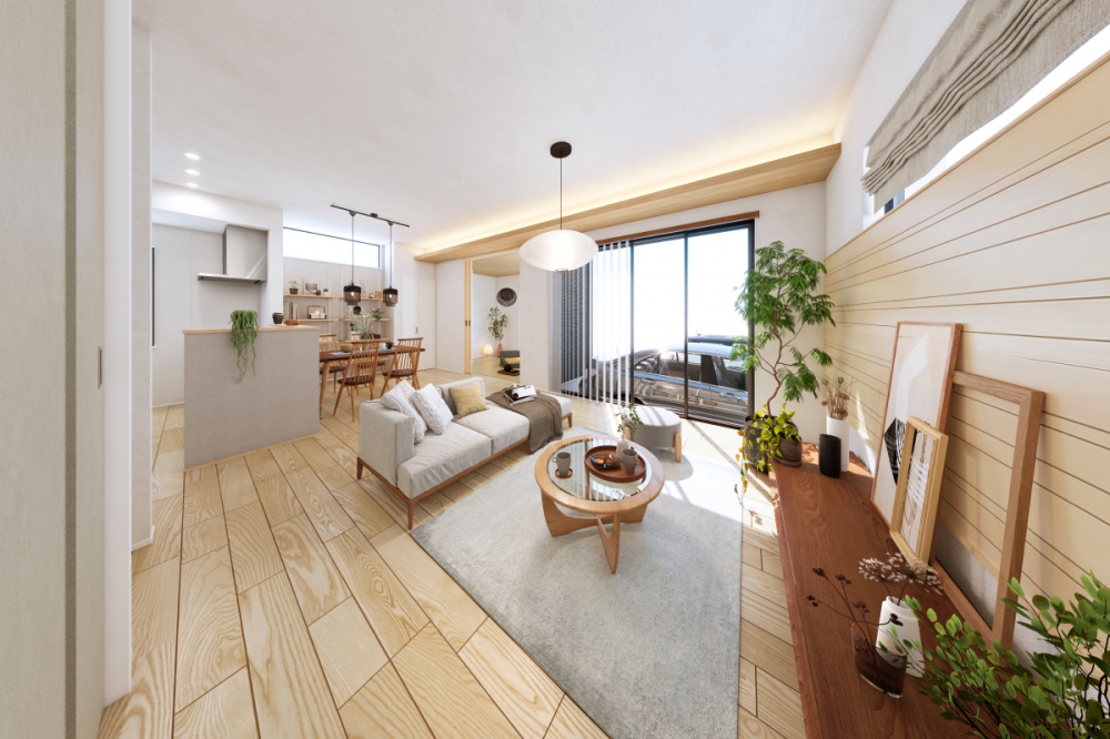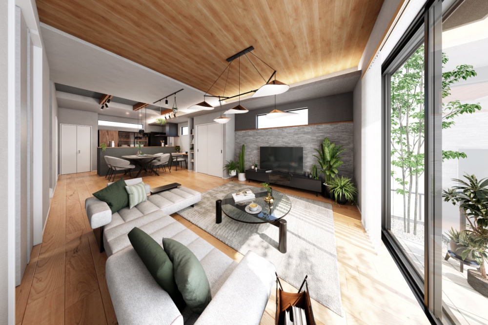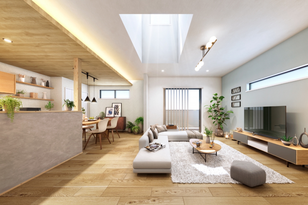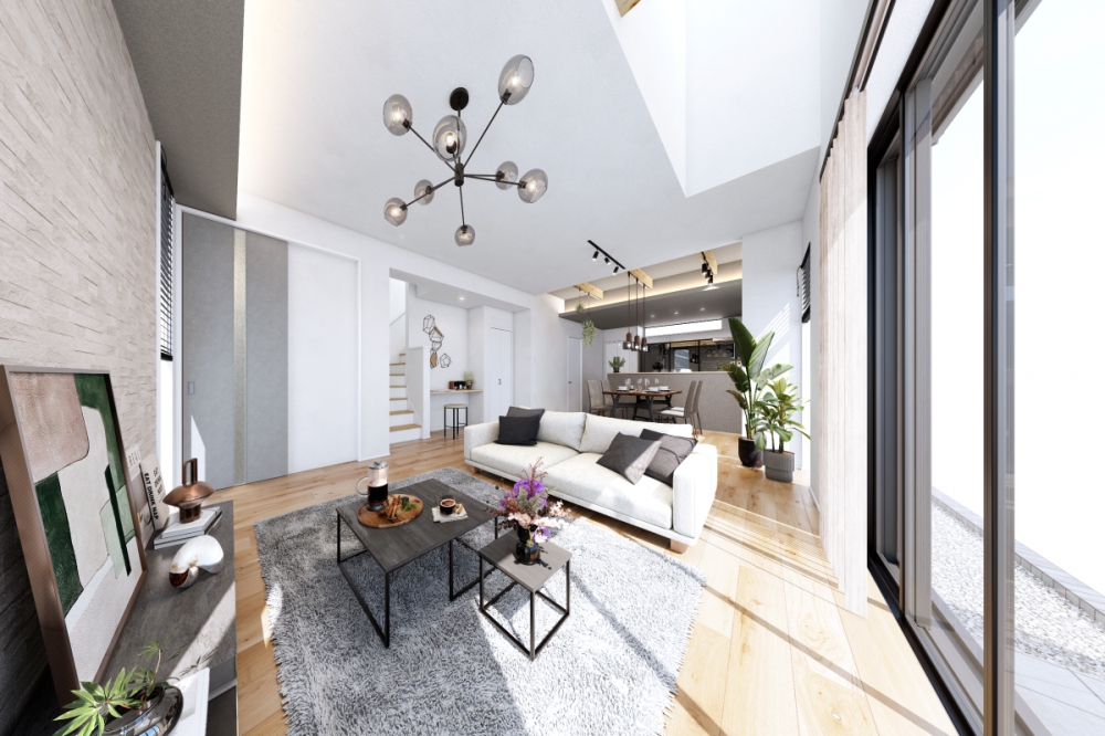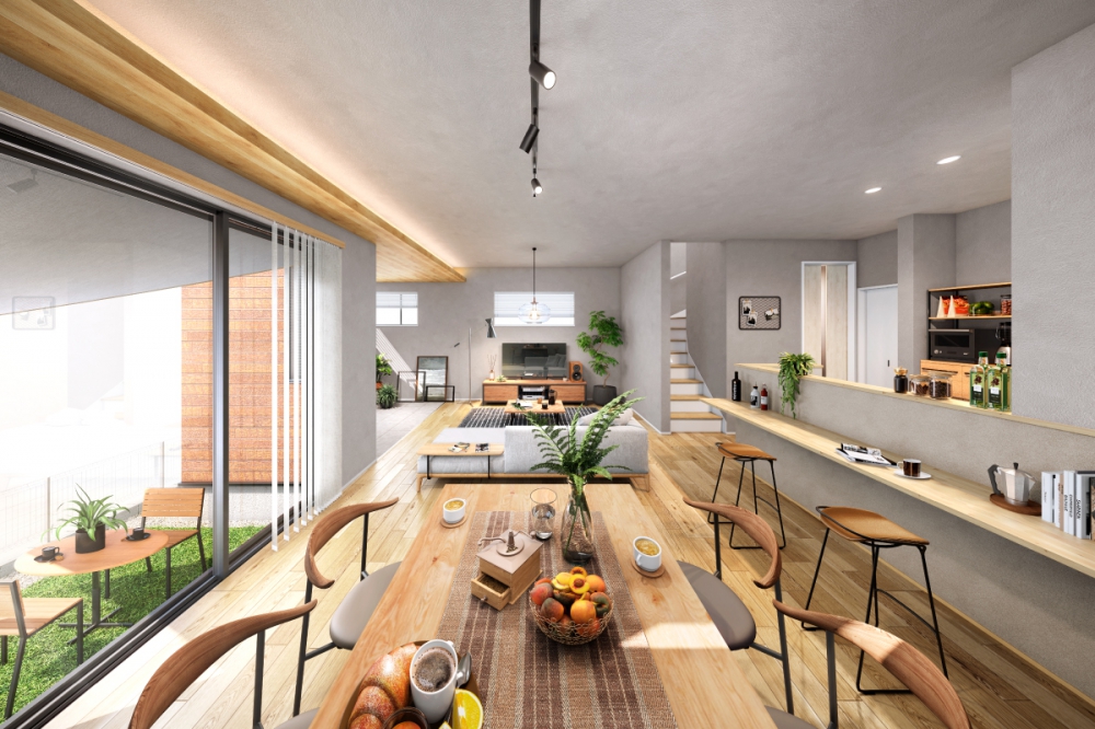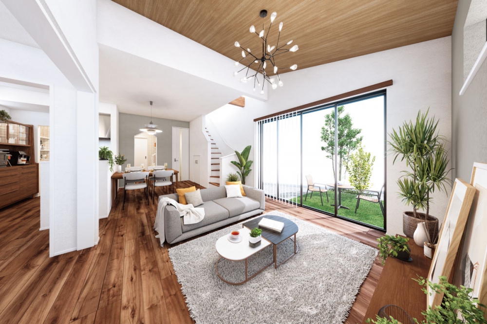 みんなが集まるLDKは、ゆったりとくつろげる22帖の広さを確保しました。プライベートガーデンに面した窓から植栽の緑を室内に採り込み、心地よい広がりを感じる設計としています。※1号棟LDK完成予想図