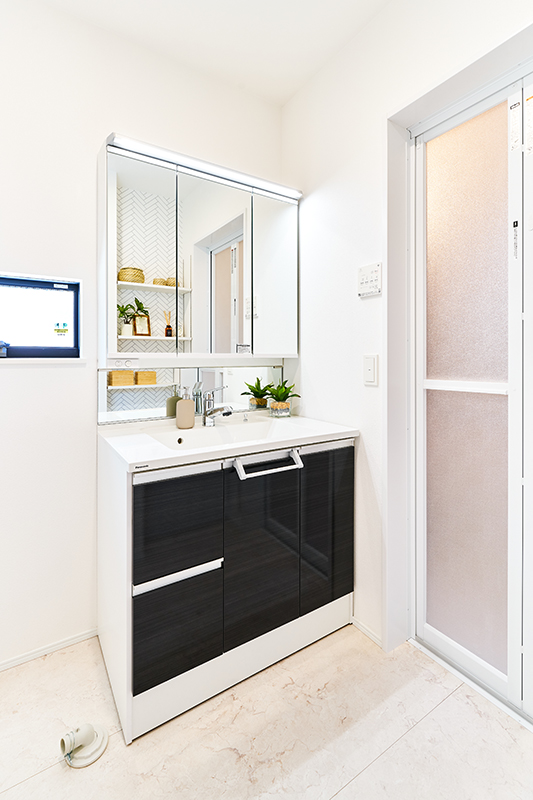 LED付照明付三面鏡や継ぎ目がなくお手入れしやすいスタイリッシュカウンター、湯水のムダを防ぐ水栓のエコカチットなど嬉しい機能を搭載しています。※写真はイメージです。