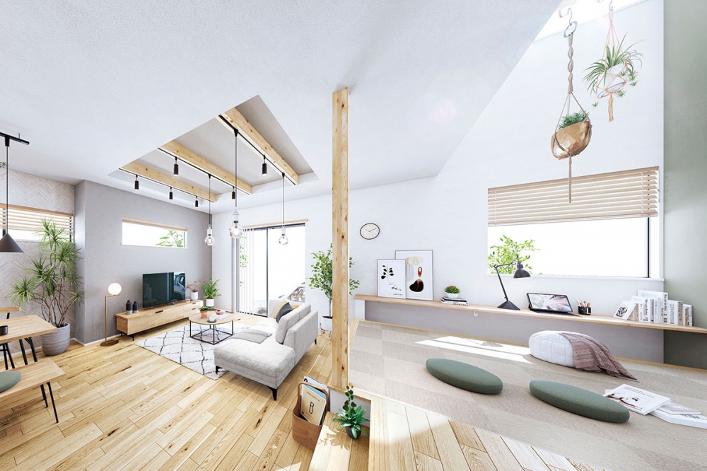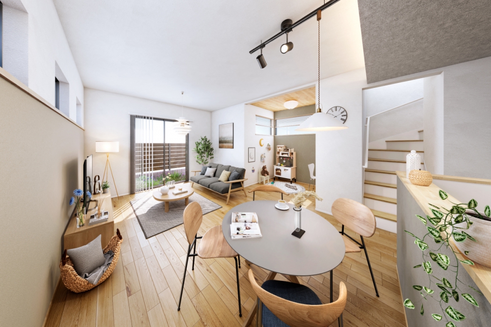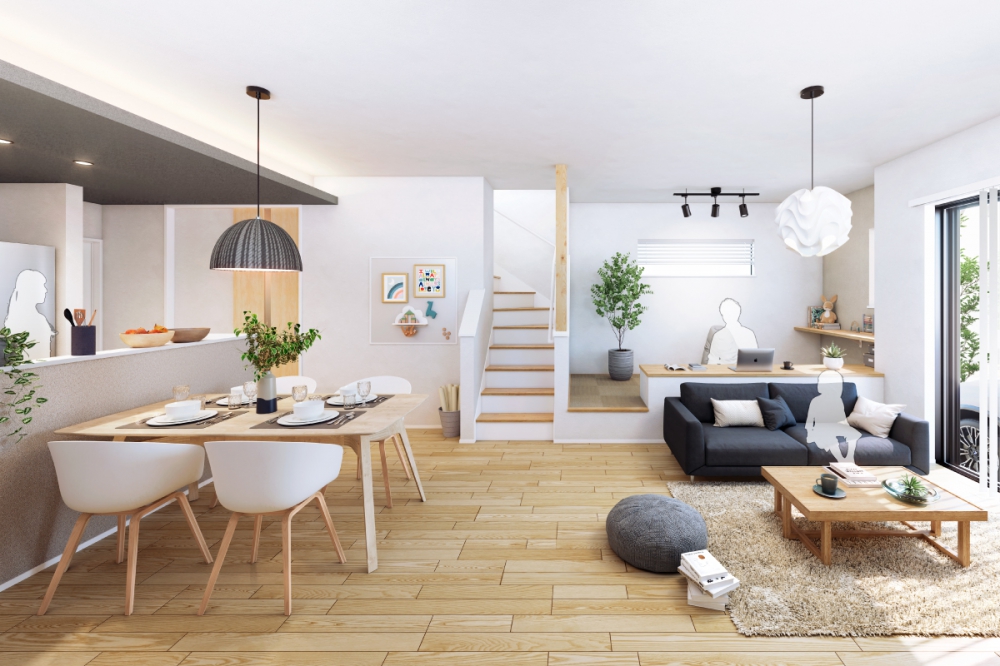 ※2号棟LDK完成予想図 1階と2階に、それぞれ多目的に使える空間をご用意。趣味やキッズスペースなど、暮らしの楽しみが広がります。
