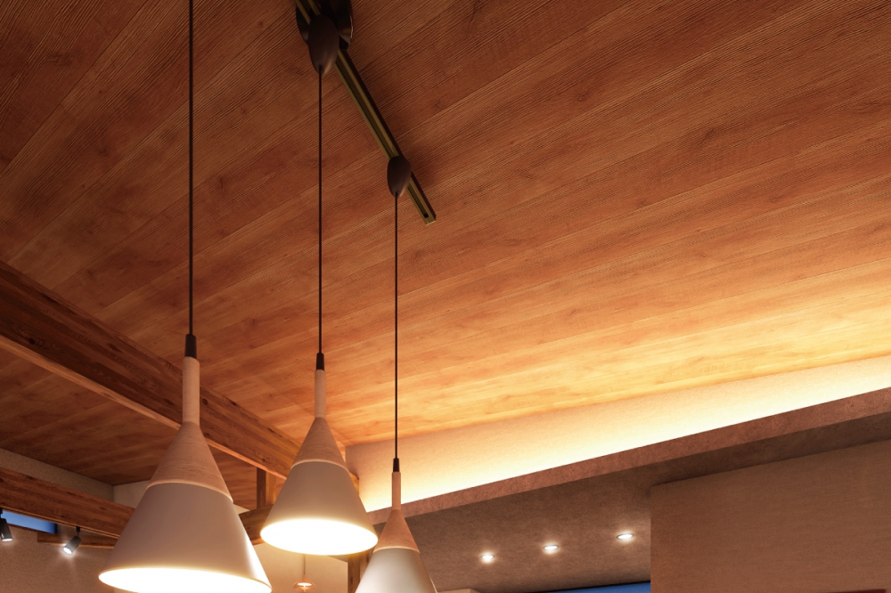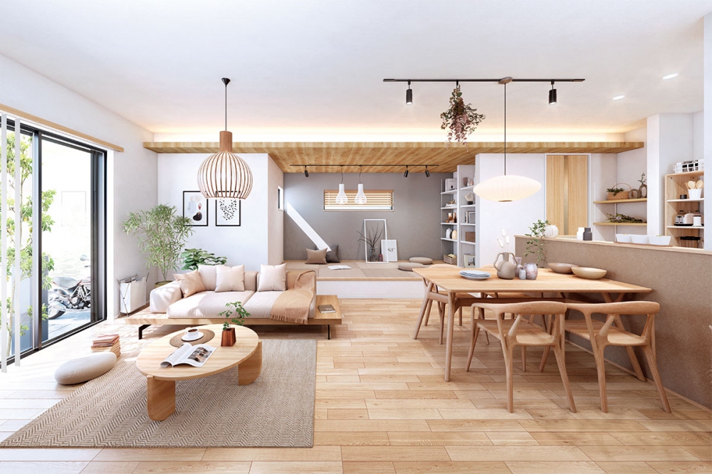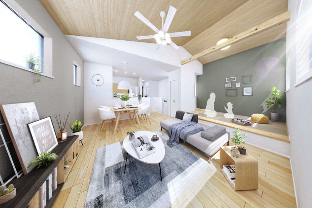 リビングと段差で緩やかに境界を設けたステップコーナーをご用意。タタミ敷きとし、天井に木目のアクセントクロスを施すことで和モダンなデザインに仕上げています。※2号棟LDK完成予想図