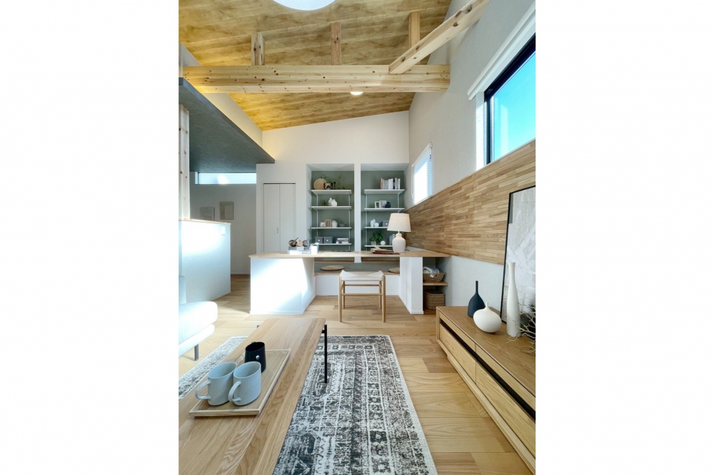 リビングや水回りを2階に配したプラン。壁面や勾配天井にもアクセントクロスを施しました。マルチコーナーは腰をかけて寛ぐこともできます。※7号棟LDK完成予想図