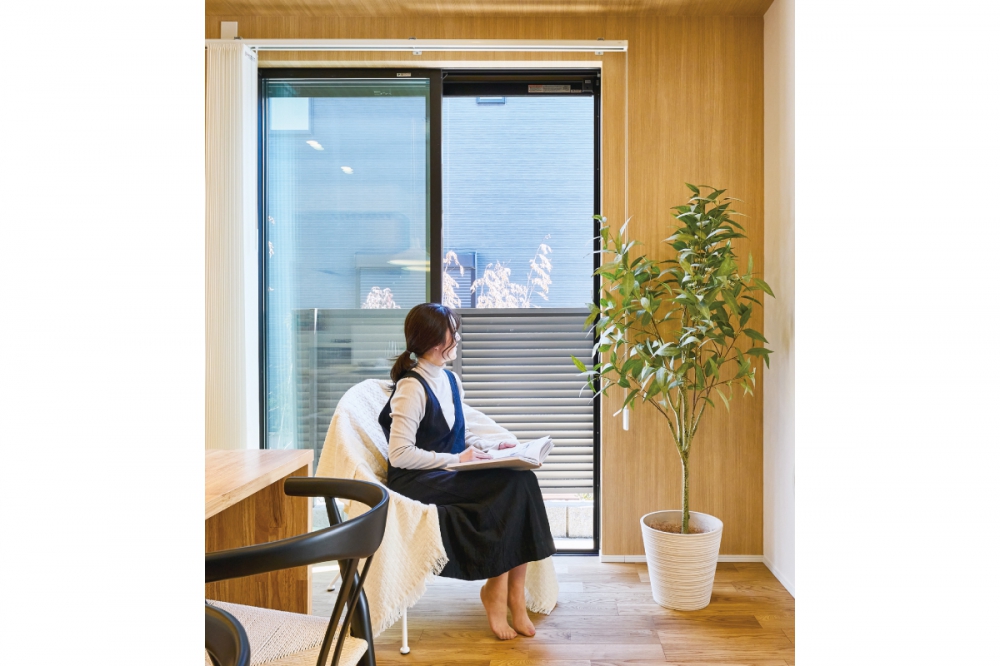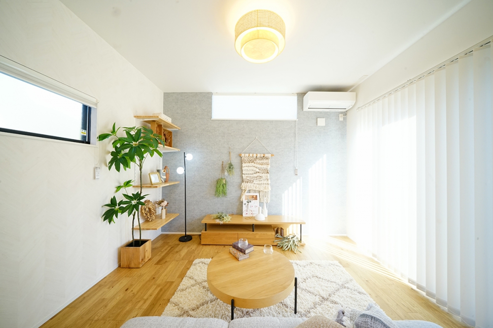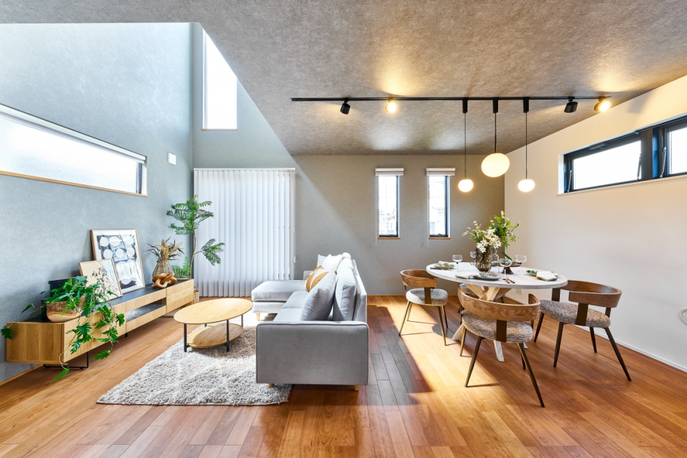 ※モデルハウス1号棟(2025年11月撮影) 南東角地ならではの、光と風に憩う住まい。ワイドサッシや高窓がもたらす心地いい開放感と空の景観が、明るく爽やかなライフシーンを叶えます。