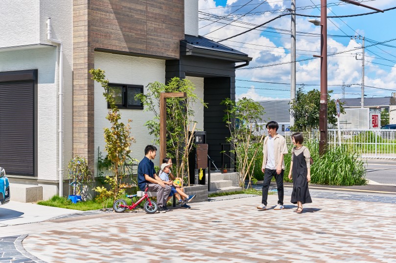 素材感を大切にしたマテリアルの組み合わせ、洗練と温もりが融け合う外観デザインが、アプローチに設けた植栽やエクステリアアイテムや陽光を採り込むガーデンスペースと相まって、彩りゆたかな街並みを描き出します。※街並み完成予想図