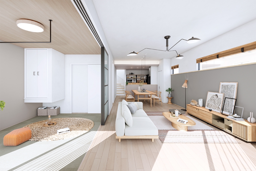リビング・ダイニングとつながる開放的な一体空間でありながら、多目的に使えるフラットマルチをご用意。趣味やキッズスペースなど、暮らしの楽しみが広がります。※3号棟LDK完成予想図