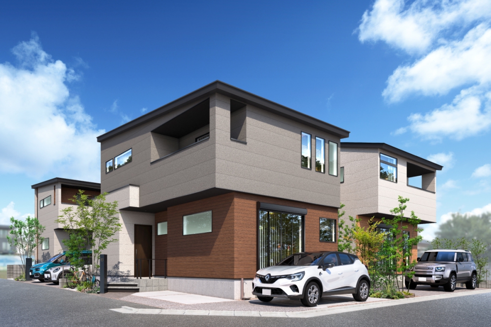 木目調のサイディングをアクセントとしてデザイン。三角屋根とナチュラルカラーが印象的なモダンスタイル邸宅が街並みを演出します。※街並み完成予想図