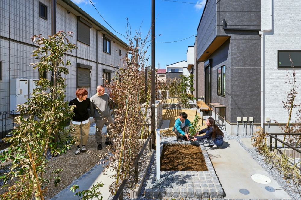 堅固な武蔵野台地の上に位置する全7邸の街並み。緑の散歩道権平山の豊かな自然と、街の中に設けた陽だまりスペースが心やすらぐ街を描き出しています。※現地街並み(2025年11月撮影)