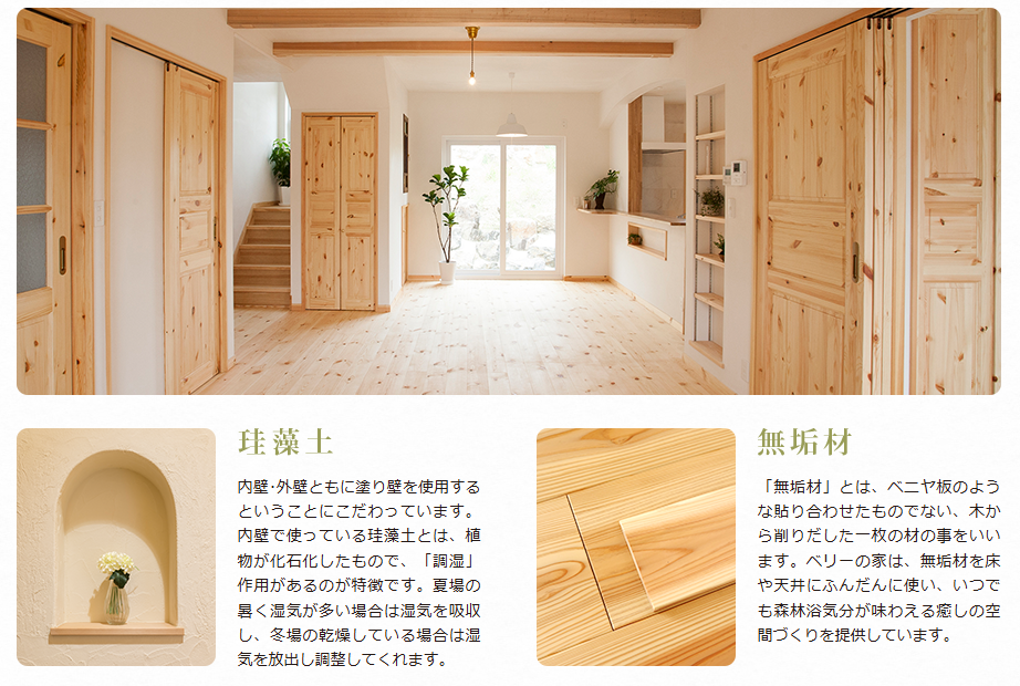 家づくりを考えるご家族の多くが35年の住宅ローンを組まれます。日本の住宅の寿命は27年と言われているのをご存知でしょうか?住宅ローンより前に、家の寿命がきてしまう…その理由は、高温多湿の環境で柱や壁が腐ってしまうためです。その答えとして、私たちが行き着いたのが「呼吸する自然素材」でした。先代から伝わる日本の伝統的な工法を取り入れつつ、新しい素材も取り入れたベリーの家を体感してみてください。