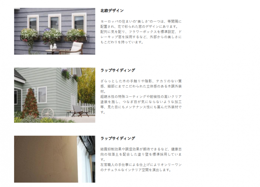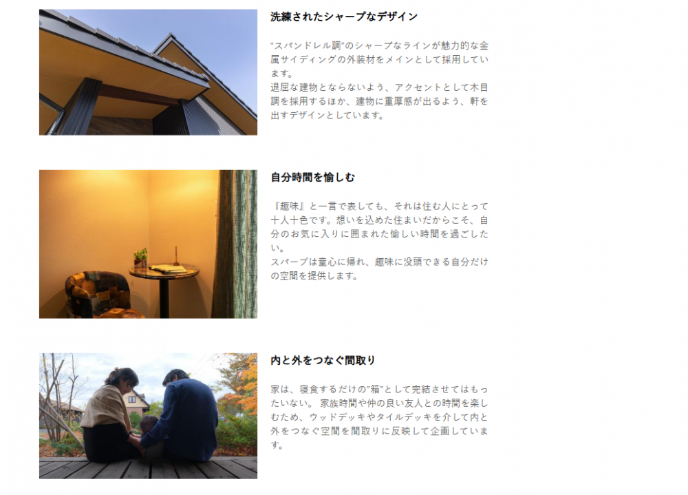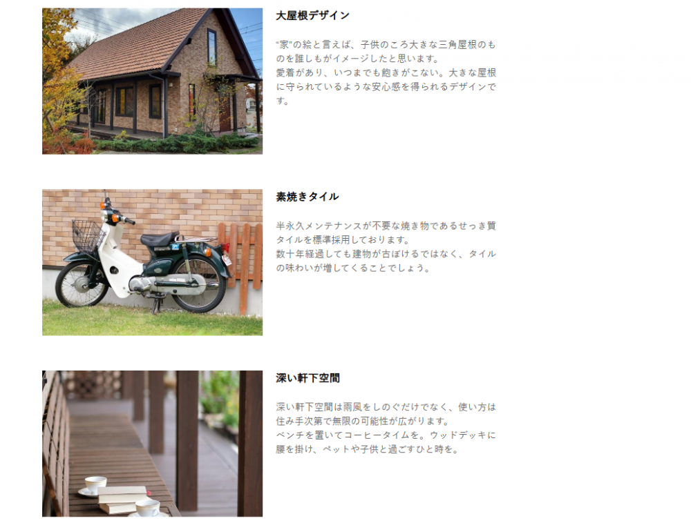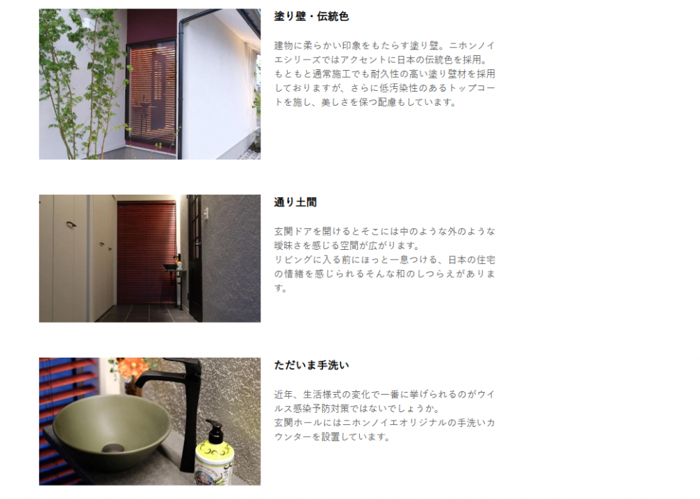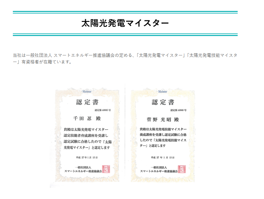 | 各種資格者 | 1級建築士(2名) 2級建築士(1名) 1級建築施工管理技士(1名) 宅地建物取引士(2名) 耐震診断士(2名) 赤外線建物診断技能士(2名) 住宅ローンアドバイザー(2名) インテリアコーディネーター(1名) ライティングコーディネーター(3名) 愛犬家住宅コーディネーター(1名) 太陽光発電マイスター(2名) 気密測定技能士(2名) 第2種電気工事士(1名) グラスウールマイスター(全大工義務付) エネルギーパスエージェント(2名) 既存住宅現況検査技術者(2名) 住宅省エネルギー技術者(2名) 環境社会検定試験(eco検定)合格者(1名) 伝統再築士(1名) CASBEE戸建評価員(1名) ハウジングスタイリスト2級(2名) 風水インテリアアドバイザー2級(1名) ホームステージャー2級(2名) |