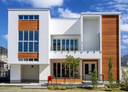 2階建て7層空間を実現するスキップフロアを採用し、多彩で利便性の高い住空間を創造。一般的な住宅と比べて高い天井高を採用した、印象的なファサードのモデルハウス。