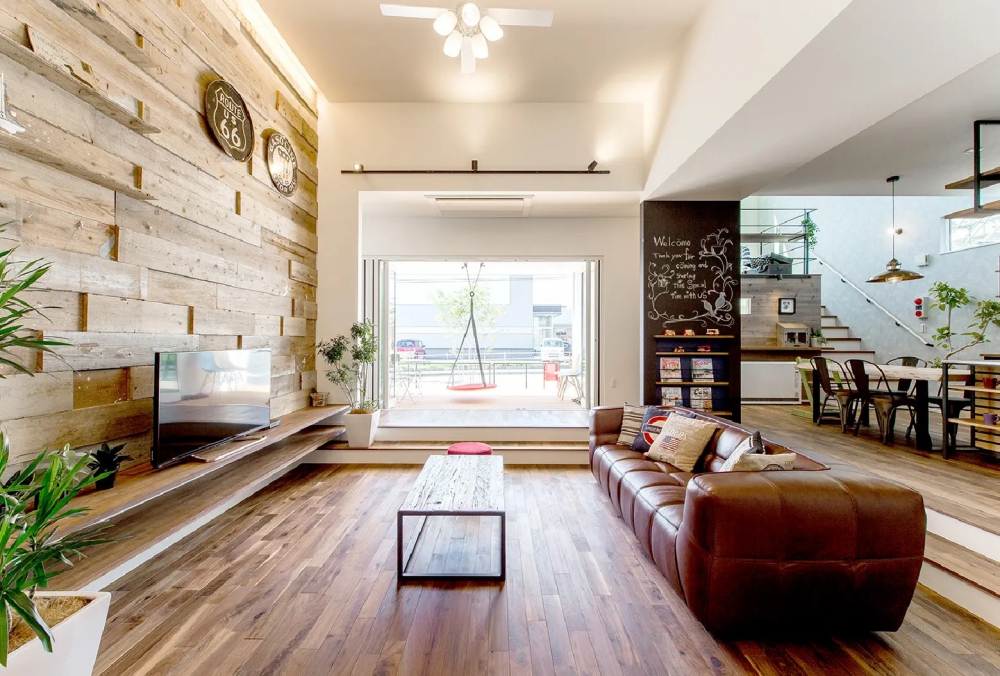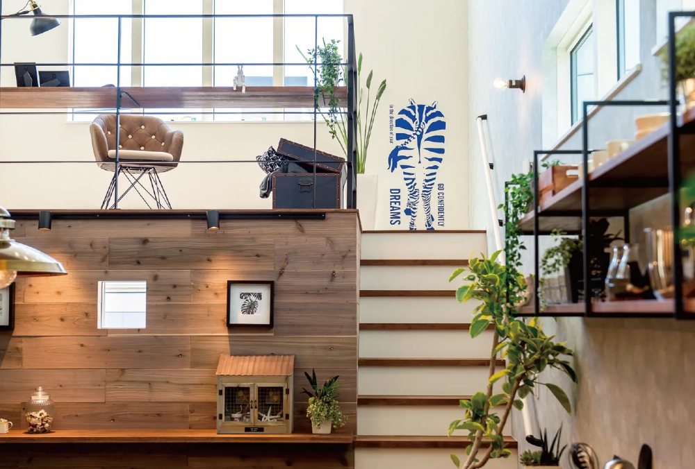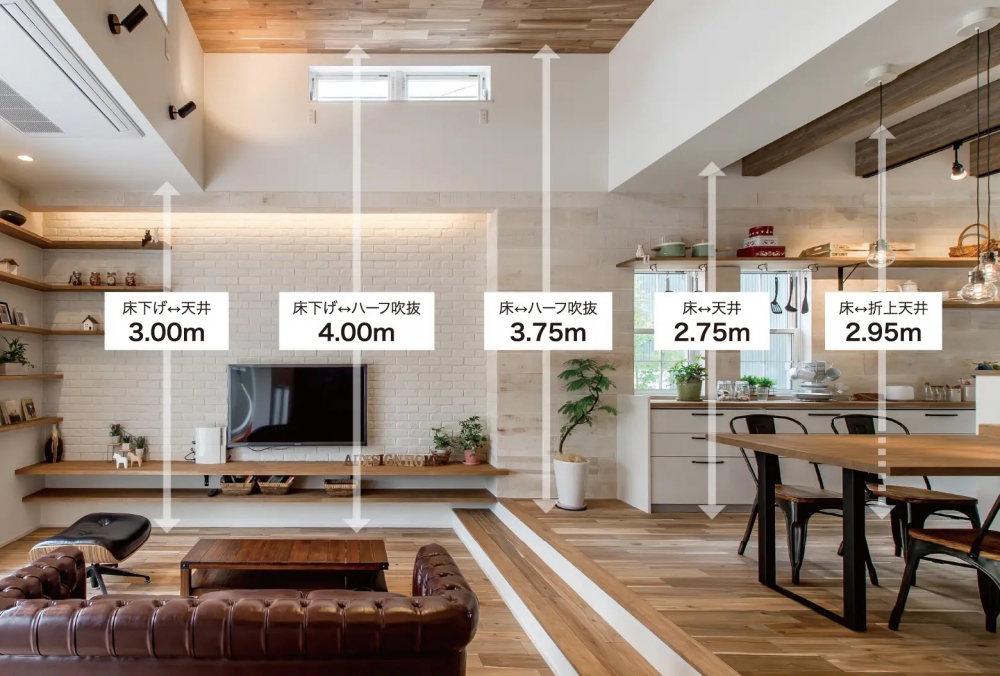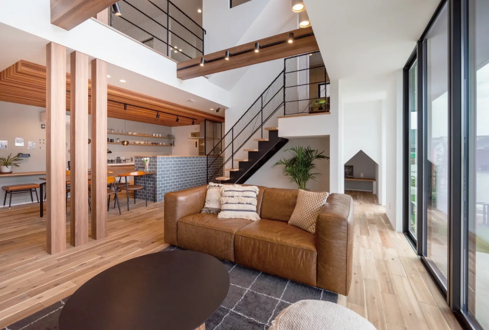吹抜・ハーフ吹抜・床下げ・スキップフロア・スキップ収納が織りなす、デザイン性の高い解放的なリビング。足場板を使ったアクセントウォールやあらわし梁が、より一層デザイン性を高めています。