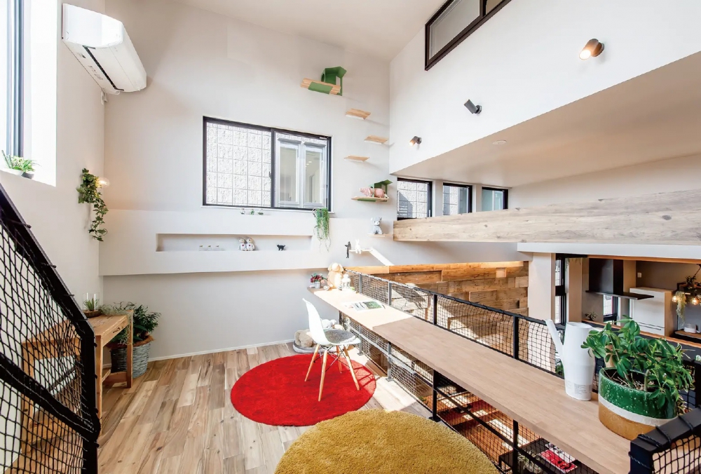 1階の居室天井高2.75m&大きな窓を多数採用した開放的な空間設計をベースに、玄関すぐの手洗い場や抗菌・除菌素材を使った部屋、趣味や収納に大活躍の2つのロフト&2つのスキップ収納、仕事や趣味に使える複数のユーティリティスペース、住まいがアスレチックに変身するボルダリング&カラフルなうんてい・複数のハンモック、バーベキューが楽しめるウッドデッキ等、住まいを楽しく快適に過ごすためのアイデア満載のモデルハウスです。