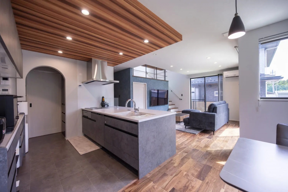 ルーバーやスケルトン階段を採用することで、大開口サッシや吹抜からの陽光を効率的にLDKへ取り込んでいます。キッチンには大容量のパントリーを備えており、使い勝手とデザイン性を兼ね揃えています。