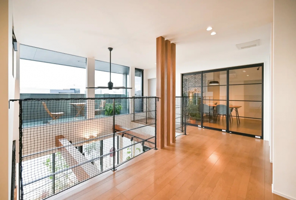 インナーバルコニーの壁面は大型のFIX窓を採用しており、2Fホールだけでなく吹抜を通じて1Fにも陽光を届けてくれます。洋室の引き戸に透明ガラスを採用することで、圧迫感のない広がりある空間を創造しています。