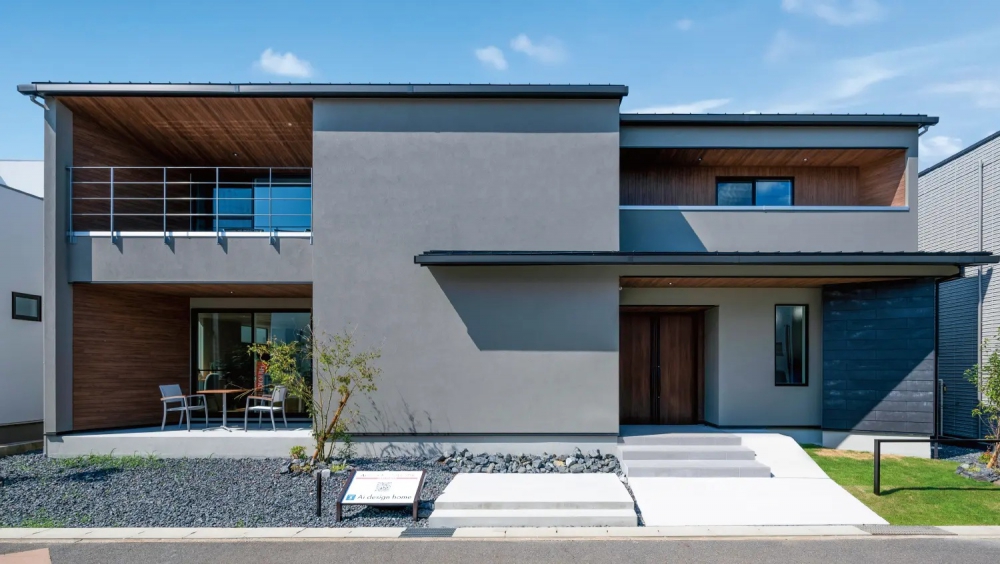 愛知県大府市「中京テレビハウジング大府」にOPENの「大府展示場」は、道路に2面接していることを有効活用し、東側はグレーを基調にスクエアな形状で構成したモダンスタイルを、西側は切妻屋根の形状を生かした可愛らしいデザインと優しい色彩で構成した、2つの異なる表情を持つ外観デザインを有したモデルハウスです。