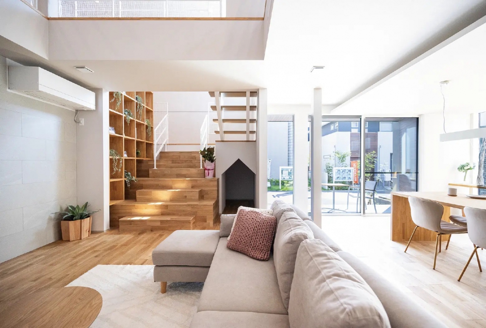 愛知県小牧市にOPENの「小牧展示場」は、限られた空間の中で住まいをより豊かにするために高低差を駆使すると共に、吹抜や透過素材などを活用して空間を数値以上に広く感じるようデザインしたモデルハウスです。
