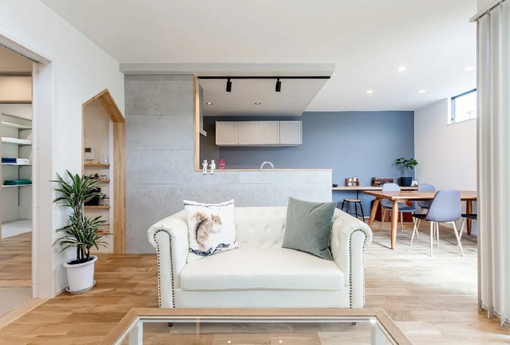 ダイニング側にアクセントウォールを採用して、オシャレな空間を創造したダイニングキッチン。レシピを読んだりPC・スタディスペースとしても活用できるカウンターも備えています。フチを木であしらった愛らしい三角の垂れ壁やフラットに繋がった和室など、家づくりのアイディアをご覧いただけます。