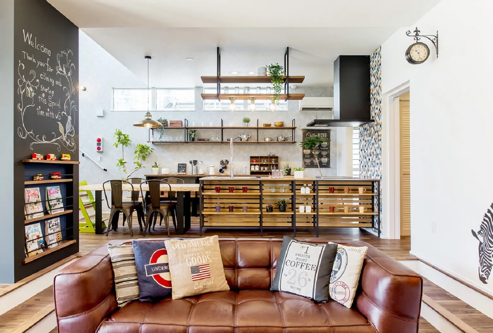 調理する人も利用する人も魅了する、まるでカフェのようなキッチンデザインを採用。ディスプレイ要素の高い収納・黒板と一体型のブックシェルフや、調理をしながら会話が楽しめるオープンキッチン・便利なパントリーなど、デザイン性と利便性を両立した素敵空間です。